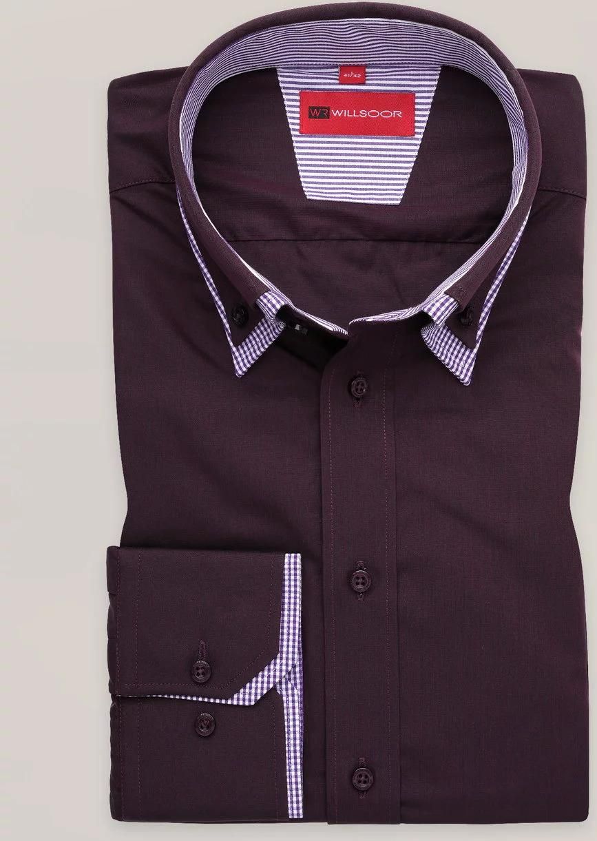 Bordowa, taliowana koszula w delikatne, szare prążki z podwójnym, podpinanym kołnierzykiem i kontrastami, 100% bawełny z formułą Easy Care