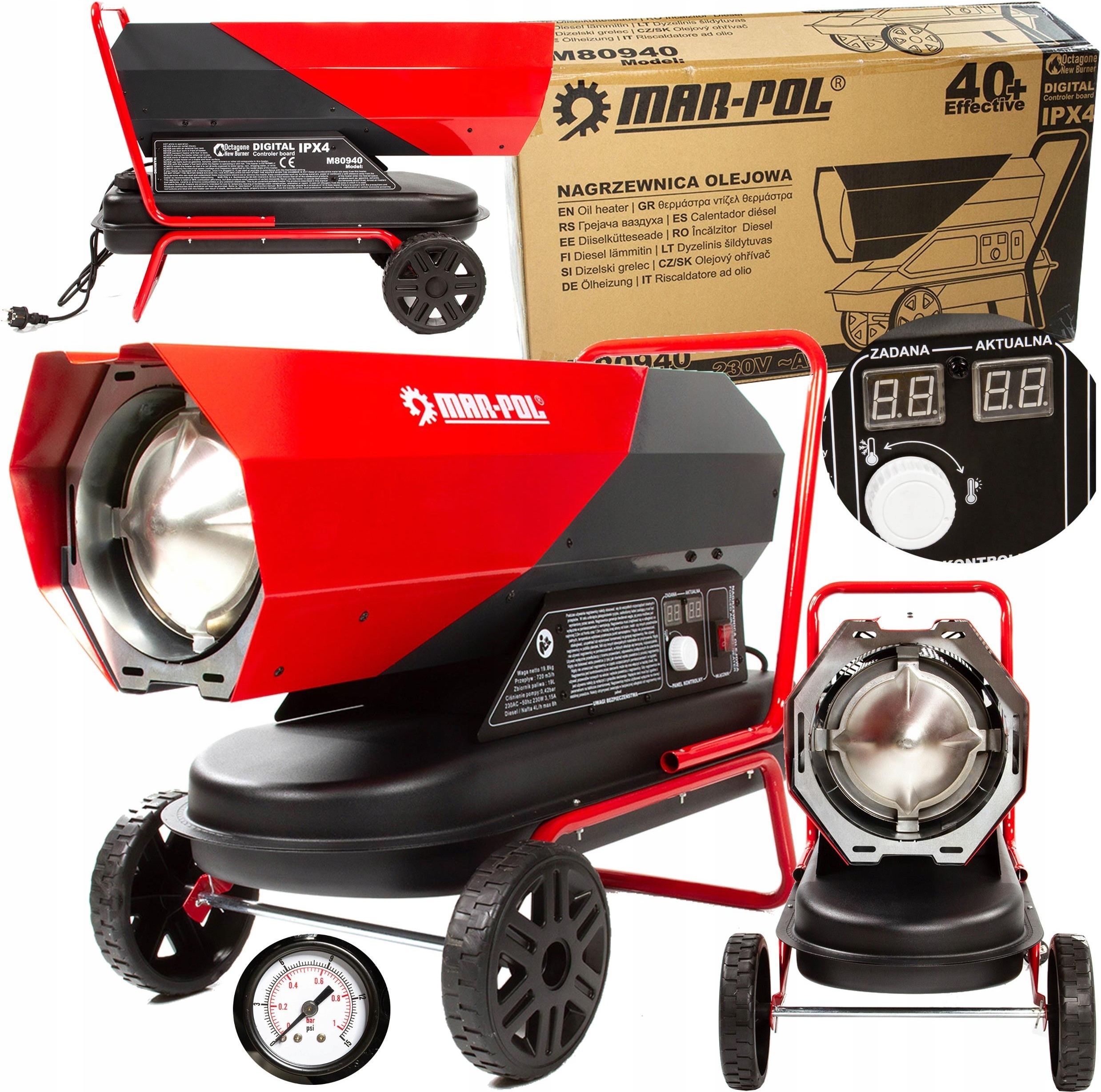 NAGRZEWNICA OLEJOWA 40KW Model: M80940 Producent: MAR-POL Mobilna nagrzewnica olejowa o mocy 40kW idealnie znajdzie swoje zastosowanie przy ogrzewaniu dużych pomieszczeń. Obudowa urządzenia została wykonana z metalu, natomiast element grzejny ze stali nierdzewnej. Przepływ powietrza wynosi 720m3/h. Dzięki otwartej komorze spalania uzyskujemy wysokie temperatury wydmuchu, pozwalające na bardzo szybkie nagrzanie obiektu lub wysuszenie materiałów. DANE TECHNICZNE ✔️ Moc: 40kW ✔️ Paliwo: olej napędowy / opałowy ✔️ Zbiornik paliwa: 19L ✔️ Napięcie zasilające: 230V/50Hz ✔️ Waga netto: 19,5 kg ✔️ Wydatek ciepłego powietrza: 720m3/h RENOMOWANY PRODUCENT, ERGONOMICZNY DESIGN, NOWOCZESNE ROZWIĄZANIA - TO CECHY WYRÓŻNIAJĄCE PREZENTOWANY PRODUKT NA TLE KONKURENCJI Oktagonalny kształt komina powoduje cichszą pracę urządzenia. Dodatkowym atutem nagrzewnicy jest wysokociśnieniowe podawanie paliwa, dzięki czemu wydajność nagrzewnicy jest większa przy takim samym zużyciu paliwa jak w urządzeniach niskociśnieniowych. ZASTOSOWANIE w domu garażu warsztacie gospodarstwie rolnym czy domkach letniskowych ZALETY PRODUKTU Urządzenie posiada ochronę przed przegrzaniem, dzięki czemu prawdopodobieństwo uszkodzenia jest ograniczone do minimum. Element grzejny ze stali nierdzewnej odznacza się wysoką trwałością i zapewnia szybkie nagrzewanie. Metalowa obudowa sprzętu sprawia, że wyróżnia się ono długą żywotnością. Innowacyjny oktagonalny kształt wycisza pracę urządzenia. Nagrzewnica wyposażona w regulację temperatury za co odpowiada dodatkowy termostat oraz pokrętło regulacji temperatury. Wyświetlacz z lewej strony wskazuje temperaturę otoczenia natomiast z wyświetlacz z prawej - temperaturę zadaną. Przekręcenie pokrętła w prawo zwiększa temperaturę do której nagrzewnica będzie dążyć, po jej osiągnięciu zmniejszy moc tak by ją utrzymywać. Wyposażona w koła, uchwyt, podstawki i poręcze ułatwiające ich transport. Jest to idealne rozwiązanie zarówno w domu, na hali magazynowej czy budowie. Zastosowane w urządzeniu podzespoły dają Ci pewność długotrwałej pracy! Urządzenie do zastosowań przemysłowych i profesjonalnych Wzmocniona obudowa wykonana z metalu Doskonale nadaje się do pracy zarówno na tarasie jak i różnych chłodnych pomieszczeniach Bardzo dobre parametry pozwalają na efektywne ogrzewanie Szybko nagrzewająca się grzałka Uchwyt ułatwiający transport