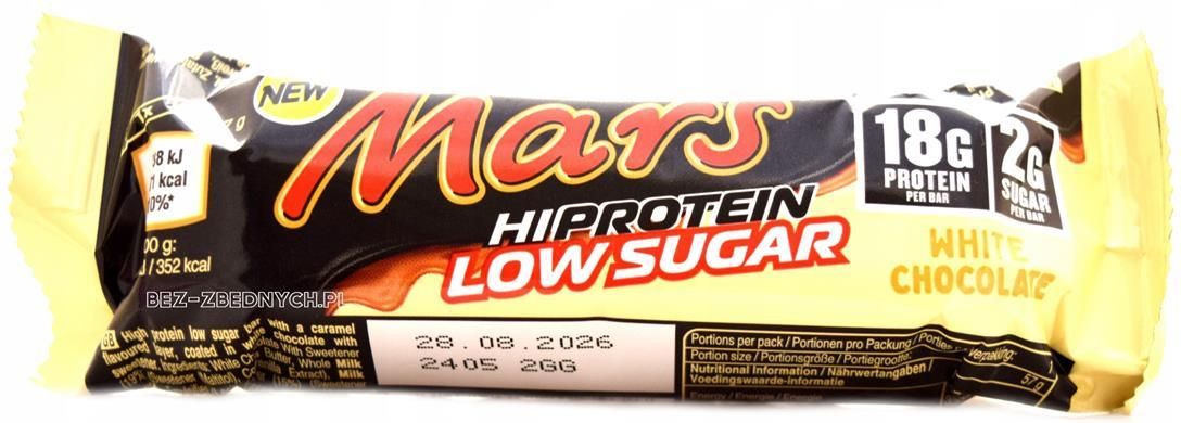 Baton Mars HiProtein Low Sugar White Chocolate | 57g Biały kruk w świecie batonów – kremowa rozkosz bez cukru, z mocą białka Miękki. Kremowy. Zmysłowy. Ten baton nie próbuje udawać słodyczy – on jest słodyczą. Ale nie tą przesadnie cukrową, sztuczną, która zostawia film na języku. Mars Hi-Protein w wersji White Chocolate oferuje coś znacznie rzadszego – prawdziwy smak białej czekolady, śmietankowy, mleczny, subtelnie otulający, niezdominowany przez wanilię, jak to bywa w tańszych imitacjach. Niezwykła harmonia smaku i konsystencji Już pierwszy kęs zaskakuje konsystencją – delikatnie ciągnący karmel bez dodatku cukru tworzy gładki, słodkawy kontrapunkt dla puszystej, nugatowej masy proteinowej, a całość otula cienka warstwa aksamitnej białej czekolady. Nie jest twarda, nie łamie się z trzaskiem – rozpuszcza się na języku jak dobre, kremowe praliny, pozostawiając przyjemne, mleczne echo. Ten baton nie tylko kusi – on wyprzedza oczekiwania. Wyjątkowy – nawet wśród wyjątkowych Większość batonów candy bar – klasycznych czy proteinowych – skrywa się za mleczną lub ciemną czekoladą. Biała czekolada to rzadkość, a wersje bez cukru i z 20g białka to już absolutna elita. To nie kolejna wariacja, ale unikat – coś, co pojawia się raz na setki batonów. Dosłownie biały kruk – i to w świecie, gdzie każdy produkt chce być „fit”, ale niewiele naprawdę na to zasługuje. Dlaczego warto go spróbować? Tylko 2,6g cukru w całym batonie Aż 20g pełnowartościowego białka Zawiera białka mleczne, serwatkowe i kolagen Idealny jako posiłek potreningowy, przekąska do kawy lub deser bez wyrzutów sumienia Unikalny smak i konsystencja – bez posmaku słodzików, bez twardych grudek i chemicznego aromatu Mars Hi-Protein White Chocolate to baton, który potrafi zaskoczyć – nie tylko tym, co zawiera, ale też tym, czego nie ma: nie ma cukrowej bomby, nie ma nudnego profilu smakowego, nie ma kompromisów. Jest za to rozkosz, którą możesz mieć na co dzień – i to w wersji fit SKŁADNIKI Wartość odżywcza w 100 g / w porcji 57 g: Wartość energetyczna: 1478 kJ / 353 kcal | 842 kJ / 201 kcal Tłuszcz: 14,0 g | 8,0 g w tym kwasy tłuszczowe nasycone: 8,1 g | 4,6 g Węglowodany: 31,0 g | 17,7 g w tym cukry: 3,0 g | 1,7 g Białko: 32,0 g | 18,2 g Sól: 0,69 g | 0,39 g % RWS – Referencyjna Wartość Spożycia dla osoby dorosłej Składniki: mleko (w tym białko mleka, mleko pełne w proszku, odtłuszczone mleko w proszku, koncentrat białek mleka, izolat białek serwatki (z mleka)), substancje słodzące (maltitol, sukraloza), masa kakaowa, substancje utrzymujące wilgoć (glicerol), izomalto-oligosacharydy, hydrolizat kolagenu (wołowego), olej słonecznikowy, masło kakaowe, środek zagęszczający (pektyna), aromaty, emulgatory (lecytyna sojowa, mono- i diglicerydy kwasów tłuszczowych), sól, substancje konserwujące (sorbinian potasu), regulator kwasowości (cytrynian sodu), barwnik (kurkumina), środek spulchniający (wodorowęglan sodu), środek glazurujący (wosk carnauba), skrobia, aromat, syrop glukozowy, jęczmień (słód jęczmienny). Alergeny: mleko, soja, jęczmień (gluten). Może zawierać: orzeszki ziemne, orzechy, jaja, pszenicę. SPOSÓB UŻYCIA Wedle uznania. Przechowywać w suchym pomieszczeniu w temperaturze do 25 st. C, w zamkniętym opakowaniu. Przechowywać w sposób niedostępny dla małych dzieci. Produkt nie może być stosowany jako substytut (zamiennik) zróżnicowanej diety. Nie przekraczać zalecanej porcji do spożycia w ciągu dnia. Informacje alergiczne: wyprodukowano w zakładzie przetwarzającym gluten, laktozę, soję oraz białka jaj.
