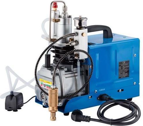 Mini kompresor HPA 300 bar Kompaktowy kompresor o stopniu sprężania do 300 bar.Wymiary: 35x18x39 cm, waga 18 kg.Chłodzony wodą, 2-stopniowe sprężanie, wydajność 30 l/min.Zasilanie 230V, pobór mocy 1600 W.Z powodzeniem może być stosowany przez indywidulanych użytkowników do napełniania kartuszy do wiatrówek i butli do markerów paintballowych Przykładowo napełnienie:- butla 0,2l 200 bar ok. 1,5 min.- butla 0,8l 200 bar ok. 5,5 min.- butla 1,1l 300 bar ok. 11 min Może też być stosowany przez małe, niezbyt intensywnie pracujące pola paintballowe (gdy czas pozwala na indywidualne napełnienie każdej butli markerowej w przerwie pomiędzy grupami, lub też po prostu przygotowanie sprzętu do gry przed przybyciem grupy danego dnia) Stosowanie go do napełniania butli matek nie wchodzi w rachubę (przykładowo napełnienie butli 33l 300 bar to netto czas ok. 5,5 godz., do tego dochodzą przerwy technologiczne związane z grzaniem się kompresora).
