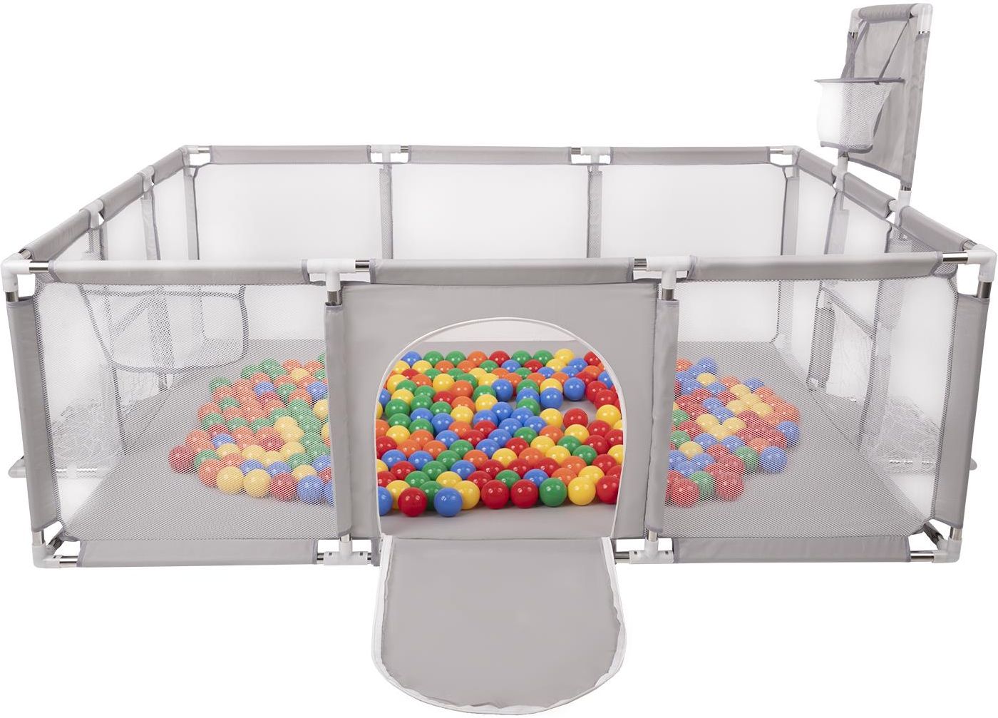 Selonis Kojec Boisko z koszem szary 100 piłeczek 6cm w zestawie: żółty-zielony-niebieski-czerwony-pomarańcz BO-100X-42-GREY Składany kojec z plastikowymi piłkami w kształcie mini-boiska zapewni Twojemu dziecku godziny zabawy. Wewnątrz jest wystarczająco dużo przestrzeni, aby w zabawie mogło uczestniczyć swobodnie kilkoro dzieci. Jednocześnie kojec można w łatwy sposób złożyć, dzięki czemu można go schować, lub zabrać ze sobą na wczasy, piknik, czy do znajomych. Boisko posiada dwie bramki do piłki nożnej oraz jedna ze ścianek jest wyposażona w siatkowy kosz do koszykówki. Dzięki temu dzieci mogą zacząć karierę w grach zespołowych. WŁAŚCIWOŚCI stabilna konstrukcja z aluminiowymi rurkami umożliwia łatwo go złożyć i rozłożyć kojec wyposażony w boczne wejście z zamkiem błyskawicznym ułatwiające wejście i wyjście dla małych dzieci boczne ścianki wykonane z siatki umożliwiają obserwację dzieci podczas zabawy, ortalion o wysokiej gramaturze jest wytrzymały i nie strzępi się zamknięta konstrukcja utrzymuje piłeczki wewnątrz pomagając zachować porządek delikatne kolory materiału i mnóstwo kombinacji piłek pozwalają dobrać odpowiedni wariant dla Twojego malucha lub dostosować kojec do każdego wnętrza wyprodukowany z bezpiecznych, nietoksycznych materiałów gładka powierzchnia, łatwa do utrzymania w czystości Cechy produktu TYP: kojec boisko z koszem KOLOR: szary KOLOR PIŁEK: żółty-zielony-niebieski-czerwony-pomarańcz ILOŚĆ PIŁEK: 100 WYMIARY: 180x122x62 cm SKŁAD: 100% poliester Piłeczki Kolor piłek w zestawie: żółty | zielony | niebieski | czerwony | pomarańcz średnica: 6 cm ilość: 100 sztuk wyprodukowane w Europie z nietoksycznego materiału przyjemne i lekkie elastyczne i odporne na zniekształcenia posiadają certyfikat CE Skład piłeczek: 100% polietylen