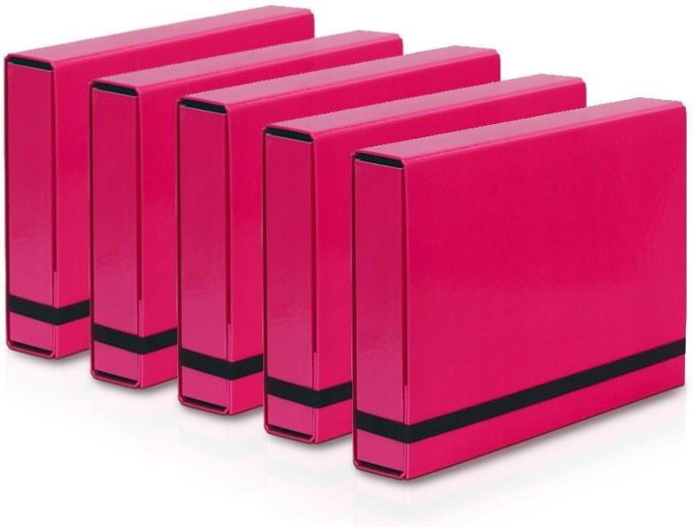 Teczka A4 Vaupe BOX na Dokumenty 50mm z Gumką 5 Szt Różowa Wykonana z twardej tektury o grubości 2 mm Posiada czarną wyklejkę z wysokiej jakości surowca Pokryta folią polipropylenową Do formatu A4 Szerokość grzbietu do 50 mm Zamykana na gumkę 341/11