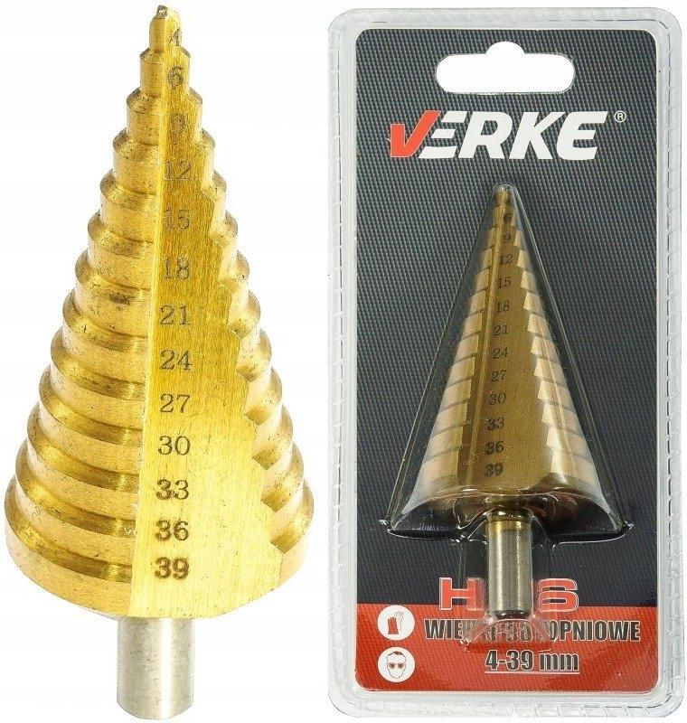 WIERTŁO STOPNIOWE STOŻKOWE HSS TYTAN 4-39 MM VERKE Wiertło stożkowe wysokiej jakości, powlekane tytanem, wykonane w technologii HSS. Wiertła stopniowane co 2 mm z uchwytami cylindrycznymi i czytelną numeracją. Wiertło do metali, blach stalowych cienkościennych, tworzyw sztucznych. Niezastąpione …