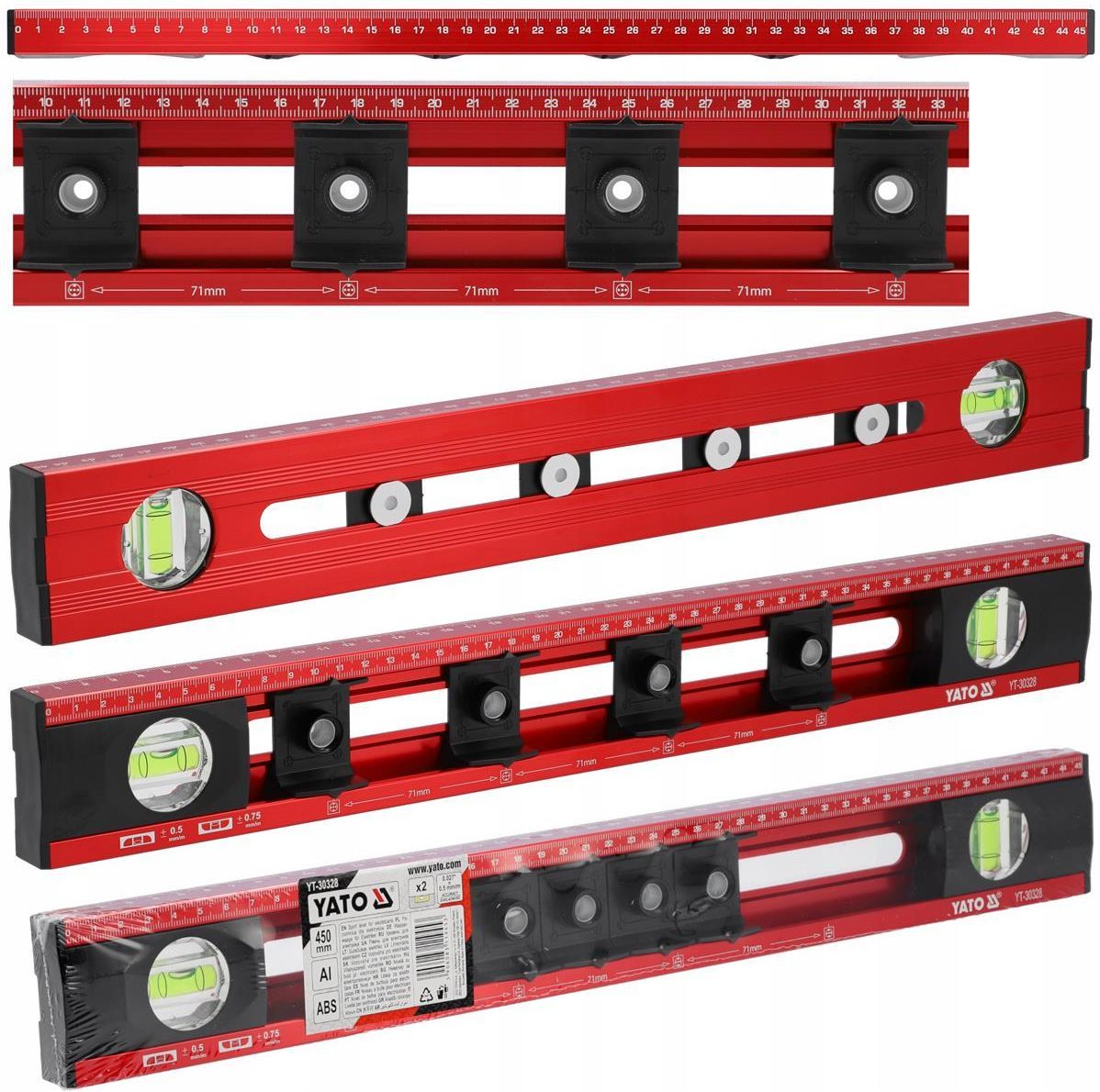 POZIOMNICA 450 MM DLA ELEKTRYKÓW Poziomnica YATO 45cm dla elektryków pozwalająca na szybki i precyzyjny pomiar, wyrównywanie i znakowanie. Umożliwia przenoszenie i oznaczaczanie odległości za pomocą suwaków znakujących na skali pomiarowej. długość całkowita: 450 mm materiał: aluminium i ABS 2 libelle spirytusowe dokładność: 0,5 mm/m = 0,027˚ Parametry Długość: 450 mm Materiał: ABS, aluminium Libelle: 2 Dokładność libelli spirytusowych: 0.5 mm/m = 0.027˚ Zastosowanie: poziomnica z możliwością przenoszenia i oznaczania odległości za pomocą czterech suwaków znakujących na skali pomiarowej AR9GWEYT-30328MK3S