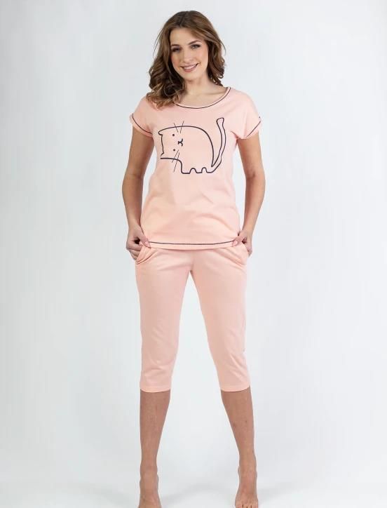 Piżama damska NARINA producent: Regina materiał: 100% bawełna Nowoczesny design oraz idealnie dobrana kolorystyka sprawią, że poczujesz się kobieco i modnie nawet w wieczornym, domowym zaciszu. Piżama damska NARINA Sen w kocim stylu! Miękka, oddychająca bawełna i uroczy koci nadruk – komfort, który pokochasz każdej nocy! Bluzka -w przyciągającej, wyszukanej morelowej barwie, -na środku duży rozczulający nadruk uroczego kociaka z przechyloną mordką - aplikacja wykonana w kolorze granatowym, -z krótkim rękawem,-półokrągły dekolt obszyty gładką lamówką, dodatkowo wzbogacony granatowym pasmem materiału,-brzegi koszulki (rękawy, dół) obszyte dekoracyjnym ściegiem z granatowej nici, -luźny fason - materiał swobodnie opada na ciele i nie krępuje ruchów, -wykonana z najwyższej jakości bawełnianego materiału, -wymiary producenta w tabeli niżej. Spodnie -o optymalnej długości 3/4 (za kolano),-w pasie wszyta wygodna, rozciągliwa guma, -fason dopasowany a'la getry, delikatnie zwężający się ku dołowi, co optycznie wysmukla sylwetkę, -po bokach na wysokości bioder dwie praktyczne kieszenie na drobiazgi, -jednolite, gładkie, -w kolorze morelowym. Świetnie sprawdzi się także jako codzienny homewear. Na uwagę zasługuje wysoka jakość materiału firmowana metką z logo POLSKIEJ firmy REGINA TABELA WYMIAROWA PRODUCENTA (wymiary podane w centymetrach) rozmiar: S M L XL 2XL 3XL WZROST 160 164 168 168 168 164 OBWÓD KLATKI PIERSIOWEJ 84 90 96 102 108 116 OBWÓD BIODER 91 96 102 107 113 120 UWAGA: Dokładamy wszelkich starań, aby kolory wyświetlane na ekranie, wiernie odzwierciedlały barwy zamawianego produktu. Mimo wszystko, mogą wystąpić nieznaczne różnice, które wynikają z indywidualnych ustawień urządzenia, na którym przeglądana jest oferta. Sprawdzona jakość produktu, poparta pozytywnymi słowami i uśmiechami klientów. Kupując tę piżamę otrzymasz nie tylko urzekającą fasonem i modnymi barwami bieliznę "do snu" lecz przede wszystkim sprawdzony, polski produkt cechujący się wysoką gramaturą bawełny i świetną jakością. Zamówienia realizujemy w 24 godziny po zaksięgowaniu wpłaty