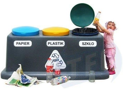 Pojemnik 3-komorowy („Trojak”)do selektywnej zbiórki odpadów o wymiarach: 1765 x 620 x 835 mm, posiada 3 otwory o średnicy 430 mm .Stosuje się w nim torby na śmieci przymocowane elastyczną obejmą, co sprawia że opróżnianie zbiornika jest wyjątkowo proste.Umożliwia on segregację odpadów w domu a także w miejscach publicznych: w przedszkolach, w szkołach, w biurach itp. Można go stosować wewnątrz, a także na zewnątrz budynków ponieważ jest on odporny na działanie warunków atmosferycznych....