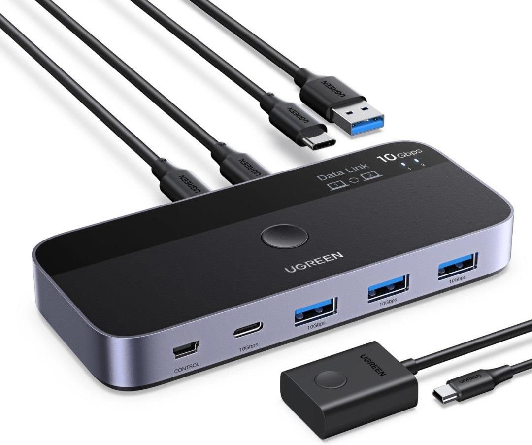 -------------------------------------------------- UGREEN SWITCH USB-C SZARY PRZEŁĄCZNIK 4 URZĄDZEŃ, TRANSFER 10GBPS 1287589240 : 203831 -------------------------------------------------- Przełącznik Ugreen switch USB-C - szary Przełącznik Ugreen switch USB-C - szary umożliwia współdzielenie nawet czterech urządzeń USB między dwoma komputerami, bez konieczności przepinania kabli. Dzięki dwóm wejściom USB-C oraz portom USB 3.2 10Gbps oferuje szybki transfer danych i wygodne przełączanie stanowiska jednym kliknięciem. Aluminiowa obudowa zapewnia lepsze odprowadzanie ciepła, a zewnętrzny przycisk sterujący ułatwia obsługę na biurku. Dodatkowe funkcje, takie jak płynne przenoszenie kursora między ekranami czy kopiowanie plików między komputerami, zwiększają komfort pracy. To rozwiązanie stworzone z myślą o osobach pracujących jednocześnie na kilku urządzeniach. Najważniejsze zalety przełącznika Ugreen Współdzielenie urządzeń USB: dwa komputery mogą korzystać z klawiatury, myszki, dysków i akcesoriów bez przepinania kabli. Superszybki transfer danych: porty USB 3.2 10Gbps zapewniają błyskawiczne kopiowanie plików. Płynne przechodzenie kursora: umożliwia wygodną pracę na dwóch komputerach jednocześnie (wymaga sterowników). Kopiowanie plików między komputerami: pozwala przenosić dane metodą przeciągnij i upuść (po instalacji sterownika). Wygodne przełączanie na biurku: zewnętrzny przycisk umożliwia zmianę aktywnego komputera jednym kliknięciem. Specyfikacja Marka: Ugreen Model: Ugreen Switch USB-C Wejście: 2 x USB-C (dla 2 komputerów) Wyjście: 3 x USB-A 3.2 10Gbps 1 x USB-C 3.2 10Gbps Funkcje: współdzielenie urządzeń USB, szybkie przełączanie, obsługa kursora między komputerami, kopiowanie plików Zasięg działania: do 10 m (w zależności od urządzeń USB) Materiał: aluminium Kolor: szary Współdzielenie urządzeń USB między dwoma komputerami Przełącznik umożliwia jednoczesne podłączenie czterech urządzeń USB i korzystanie z nich naprzemiennie na dwóch komputerach, co zwiększa wygodę pracy wielostanowiskowej. Szybki transfer danych 10Gbps Porty USB 3.2 zapewniają transfer do 10Gbps, co pozwala na błyskawiczne kopiowanie dużych plików i komfortową pracę z dyskami zewnętrznymi. Przenoszenie kursora między ekranami Po instalacji sterownika przełącznik umożliwia płynne przenoszenie kursora między komputerami, co znacznie usprawnia pracę przy wielu ekranach. Kopiowanie plików przeciągnij i upuść Funkcja umożliwia szybkie kopiowanie danych między komputerami bez konieczności korzystania z pendrive’ów czy sieci lokalnej. Wygodne sterowanie jednym przyciskiem Zewnętrzny przycisk pozwala przełączać się między komputerami jednym ruchem, co poprawia ergonomię pracy przy biurku.