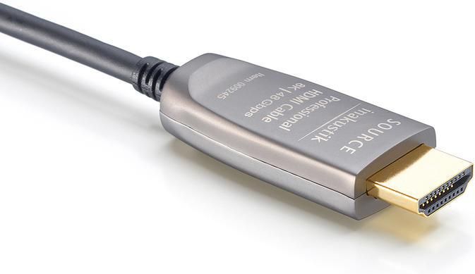 Inakustik HDMI 2.1 8K Optical Fiber Cable - optyczny przewód HDMI/HDMI o długości 15m. Produkt pochodzi od oficjalnego dystrybutora in-akustik na Polskę! Przeznaczony jest do zastosowań komercyjnych, jak np. studia nagraniowe, postprodukcja filmowa czy różnego rodzaju instalacje prezentacyjne. Oczywiście można go stosować także w domowych instalacjach audio/video. Generalnie wszędzie tam, gdzie potrzebna jest transmisja materiału wysokiej rozdzielczości na bardzo duże odległości. Inakustik HDMI 2.1 8K Optical Fiber Cable to przewód HDMI wykonany w technologii światłowodowej. W odróżnieniu od typowego przewodu z żyłami miedzianymi pozbawiony jest niepożądanego zjawiska interferencji elektromagnetycznej. Poza tym zapewnia separację galwaniczną łączonych urządzeń. To wszystko pozwala na transmisję danych bez strat nawet na poziomie 48 Gbps. Ogólna charaktrystyka produktu metalowe, pokryte 24-karatowym złotem końcówki przewód kierunkowy, wykorzystujący technologię światłowodową zasilanie przez złącze HDMI - żadne dodatkowe źródło zasilania nie jest potrzebne obsługa standardu HDMI™ High Speed with Ethernet 2.1 oraz wszystkich wcześniejszych wersji przepływność sygnału na poziomie 48 GBit/sek. - obsługa rozdzielczości 8K przy 50/60 Hz z HDR, HDR10 i HDR10+ zgodny ze standardami HDCP 2.3 oraz EDID obsługuje DSC (kompresja strumienia wyświetlania) ARC do 50 m średnica kabla: 4 mm bardzo elastyczny i łatwy w instalacji