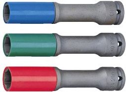 Klucz nasadowy udarowy wydłużony do kół do alufelg 17 mm 1/2" bardzo długi z osłoną felg aluminiowych Wymiar 17mm Średnica zewnętrzna O 27 mm Długość L-150 mm Do kluczy pneumatycznych, elektrycznych 1/2 cala Osłona z tworzywa sztucznego kolor niebieski Stal chromowo-molibdenowa, ulepszona cieplnie, fosforanowana