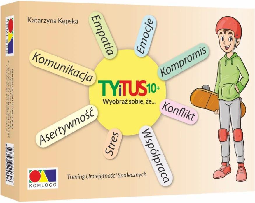 Karty "TYiTUS 10+ Wyobraź sobie, że..." Karty „TYiTUS 10+ Wyobraź sobie, że…” to unikalne narzędzie stworzone z myślą o wspieraniu rozwoju emocjonalnego i społecznego dzieci i młodzieży od 10. roku życia. Zestaw przeznaczony jest dla pedagogów, psychologów, terapeutów i innych specjalistów, którzy pracują z dziećmi zarówno indywidualnie, jak i w grupach, także w ramach Treningu Umiejętności Społecznych (TUS). Zestaw składa się z ośmiu talii kart, które poruszają ważne obszary życia społecznego, takie jak: asertywność, rozpoznawanie emocji, empatia, komunikacja, kompromis, rozwiązywanie konfliktów, radzenie sobie ze stresem oraz współpraca. Każda talia zawiera 24 karty opisujące realistyczne sytuacje z życia codziennego. Scenariusze te, wzbogacone pytaniami i poleceniami, pozwalają uczestnikom lepiej zrozumieć swoje emocje i reakcje oraz ćwiczyć praktyczne umiejętności interpersonalne. Karty dobrze sprawdzają się w diagnozowaniu potrzeb uczestników, ponieważ odpowiedzi na zawarte w nich pytania wskazują specjalistom obszary wymagające dalszej pracy. Narzędzie to można stosować w szkołach, poradniach psychologiczno-pedagogicznych, na warsztatach integracyjnych czy zajęciach rozwojowych. Dzięki uniwersalnej konstrukcji karty są odpowiednie zarówno dla dzieci, które mają trudności w relacjach społecznych, jak i tych, które chcą doskonalić swoje umiejętności. „TYiTUS 10+ Wyobraź sobie, że…” łączy w sobie edukację, zabawę i praktyczne podejście, dzięki czemu nauka staje się bardziej angażująca i efektywna. To dobre wsparcie dla specjalistów i rodziców, którzy chcą wspierać młodzież w budowaniu zdrowych relacji i pewności siebie w relacjach z innymi. [ikony-produktu-opisy] Co zawiera? 8 talii kart (192 karty – po 24 szt. w każdej talii), instrukcja Główne informacje Producent: Komlogo Materiał: papier Autor: Katarzyna Kępska Rok wydania: 2022 ISBN: 978-83-66224-69-8 Wymiary kart: 105 x 74 mm Wymiary instrukcji: 194 x 104 mm Wiek: 10+ Kategorie kart: zachowania asertywne, rozpoznawanie emocji, odczuwanie empatii, umiejętność komunikowania się, osiąganie kompromisu, rozwiązywanie konfliktów, radzenie sobie ze stresem, podejmowanie współpracy. Pomysły na zabawę Empatia w działaniu - rozwijanie empatii i zrozumienia dla innych Uczestnicy wybierają kartę, która przedstawia sytuację, w której ktoś inny przeżywa trudności. Ich zadaniem jest zastanowić się, jak mogą okazać wsparcie tej osobie i co mogłoby pomóc jej poczuć się lepiej. Po omówieniu odpowiedzi, grupa dyskutuje o różnych formach wsparcia i o tym, jak ważna jest empatia w codziennych relacjach. Rozwiązujemy konflikty – ćwiczenie umiejętności rozwiązywania konfliktów i komunikacji Wybierz jedną kartę, która opisuje konfliktową. Uczestnicy na zmianę odgrywają różne role – osoby zaangażowane w konflikt oraz osoby trzecie, które mogą pomóc rozwiązać problem. Po zakończeniu odgrywania scenki grupa omawia, jak różne rozwiązania mogłyby wpłynąć na sytuację, a także jakie umiejętności interpersonalne byłyby przydatne.