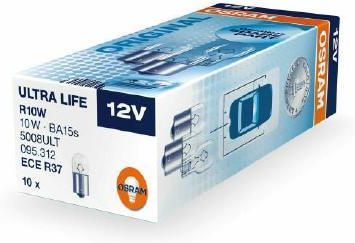 ŻARÓWKA R10W 12V OSRAM ULTRA LIFE BA15S LONG LIFE Żarówki OSRAM ULTRA LIFE to produkty o trwałości nawet cztery razy dłuższej w porównaniu ze standardowymi żarówkami halogenowymi. Zostały one zaprojektowane tak by wytrzymywać długotrwałą eksploatację i niesprzyjające warunki pracy przy zachowaniu standardowych parametrów jasności i ilości emitowanego światła stając się tym samym idealnym rozwiązaniem dla często podróżujących w dzień lub po dobrze oświetlonych drogach w mieście. Dane techniczne Trzonek: BA15s Napięcie (V): 12 Moc (W): 10 Numer katalogowy części: 5008ULT Stan: Nowy Rodzaj: Tradycyjne / halogenowe Typ żarówki: R10W Model: ULTRA LIFE Liczba sztuk: 1