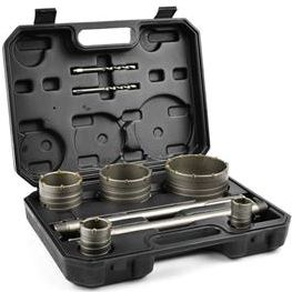 Otwornice z widią do betonu 9el GekoWykonane z materiałów najwyższej jakości. Wieniec zębaty otwornic wykonany został z węglików spiekanych. W komplecie znajdują się adaptery 300mm z wiertłem prowadzącym, przeznaczone do stosowania z wiertarkami posiadającymi uchwyt montażowy SDS-Plus lub SDS-Max.Otwornice tego typu przeznaczona jest do wykonywania otworów pod instalacje elektryczne (puszki, gniazdka itp.) w różnego typu materiałach budowlanych takich jak np. beton, płyty gipsowo-cementowe, płyty gipsowe, cegła, glazura itp.Charakterystyka produktu: w zestawie pięć otwornic oraz dwa adaptery 300 mm SDS-Plus oraz SDS-Max wieniec zębaty otwornic z węglików spiekanych otwornice w rozmiarach od 30 mm do 100 mm adaptey z wiertłami prowadzącymi całość zestawu zapakowana w poręczną walizkę z tworzywa sztucznegoSpecyfikacja techniczna: Materiał: stal, węglik spiekanych Średnice otwornic: 30, 40, 65, 80, 100 mm Wysokość otwornic: 75 mm Mocowanie: SDS-Plus, SDS-Max