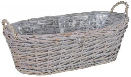 SZARY PODŁUŻNY KOSZ WIKLINOWY Z UCHWYTAMI 50x27x16/20 cm Wiklinowy kosz z folią do obsadzania kwiatami. Specyfikacja Wymiary*: długość zewnętrzna: 50 cm szerokość zewnętrzna: 27 cm wysokość bez uchwytów: 16 cm wysokość z uchwytami: 20 cm Cechy produktu: wykonany z naturalnego materiału: wikliny kolor: odcienie szarości dekoracyjne uchwyty ś rodek kosza obszyty przezroczystą folią ochronną rękodzieło przeznaczenie: osłona na kwiaty doniczkowe lub do bezpośredniego obsadzania roślinami * wymiary mogą się nieznacznie różnić od podanych ze względu na ręczne wykonanie z naturalnego materiału