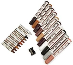 Zestaw do naprawy mebli paneli markery 21el Zestaw do naprawy uszkodzeń powstałych w panelach, meblach, drzwiach oraz innych materiałach drewnopodobnych itp. Zestaw pozwala w estetyczny i tani sposób zamaskować pęknięcia, wyszczerbienia itp. W skład zestawu wchodzi 10 kolorów pisaków oraz 10 kredek woskowych w tych samych kolorach. Naprawa uszkodzonej powierzchni odbywa się dwuetapowo, w pierwszej kolejności należy wypełnić ubytek półtwardą kredką woskową w odpowiednio dobrany kolorze, a następnie pokrycie tego miejsca olejowymi pisakami tworząc strukturę przypominającą drewno.Charakterystyka produktu: doskonale sprawdzi się podczas naprawy/maskowania uszkodzonych powierzchni z materiałów drewnianych lub drewnopodobnych zestaw zawiera 10 kredek woskowych oraz 10 pisaków olejowych oraz temperówka pisaki tworzą powłokę odporną na zmywanie pozwala w łatwy i tani sposób dokonać naprawy uszkodzonych powierzchniSpecyfikacja techniczna: Ilość elementów zestawu: 21 Ilość kredek woskowych: 10 Ilość pisaków olejowych: 10 Kolory pisaków oraz wosku: czarny, szary, biały, mahoń, klon, dąb, wiśnia, orzech włoski, burnt sienna, kasztan