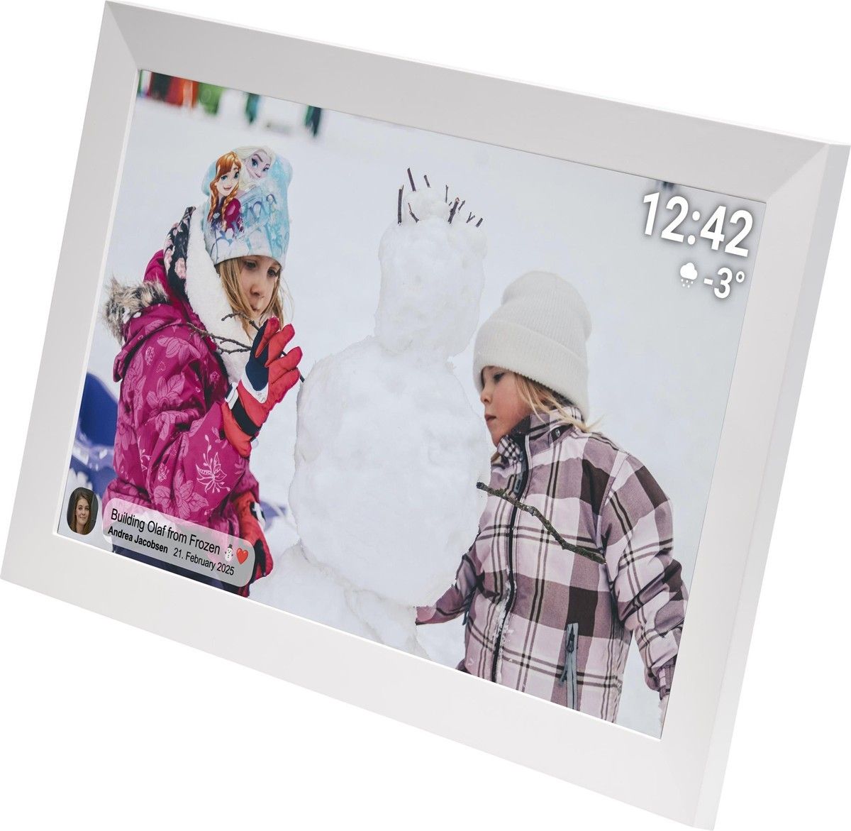 15,6-calowa cyfrowa ramka na zdjęcia z Wi-Fi i oprogramowaniem FRAMEO. Wysyłaj zdjęcia z aplikacji na smartfonie bezpośrednio do ramki. Udostępniaj wspomnienia natychmiastowo z FRAMEO.Wysyłaj zdjęcia bezpośrednio do ramki przez Wi-Fi, korzystając z aplikacji FRAMEO – idealne do utrzymywania kontaktu z bliskimi. Jaskrawy wyświetlacz Full HD.Ciesz się wyraźnymi, żywymi obrazami na 15,6-calowym ekranie IPS o rozdzielczości 1920x1080 i szerokich kątach widzenia. Płynna wydajność i wystarczająca ilość miejsca do przechowywania.Wyposażona w 32GB pamięć flash EMMC i 1GB RAM DDR, zapewniającą szybką pracę i dużo miejsca na Twoje ulubione chwile. Łatwe podłączanie i obsługa z ekranem dotykowym.Wbudowane Wi-Fi (802.11 b/g/n) i responsywny ekran dotykowy sprawiają, że konfiguracja i nawigacja są bezproblemowe. Prostota Plug & Play.W zestawie znajduje się zasilacz DC o długości 1,8 metra oraz czujnik G do automatycznego obracania ekranu. Gotowy do użycia zaraz po wyjęciu z pudełka. Cechy: Nazwa aplikacji: Frameo. Darmowa aplikacja na Androida i iOSMateriał ramki: plastikJPEG: TakPamięć: 1 GBTyp pamięci: DDR RAMCzytnik kart MicroSD: Tak (maksymalny rozmiar karty) 64GBNapięcie zasilacza: 240 woltówRozdzielczość: 1920x1080 pikseliProporcje ekranu: 16:9Rozdzielczość ekranu: 1920x1080 pikseliRozmiar ekranu (cale): 15,6 calaTyp ekranu: IPSWbudowany głośnik: TakPamięć do przechowywania: 32 GBStojak na biurko: TakUSB-A: TakPort USB-A do przesyłu danych: TakUSB-C: TakPort USB-C do obsługi/przesyłu danych: TakStandard VESA: 100x100Obsługa wideo: TakFunkcja Wi-Fi: TakPamięć operacyjna: 1 GBWymiary: 39,6 x 24,5 x 2,7 cmWaga: 1,97 kg Długość przekątnej ekranu:39,6 cm (15.6")Rozdzielczość:1920 x 1080 pxTyp ekranu:IPSEkran dotykowy:TakFormat obrazu:16:9Natywna częstotliwość odświeżania:60 HzFormat kompresji zdjęć:JPEGZintegrowany czytnik kart:TakWbudowana pamięć:TakPojemność pamięci wewnętrznej:32 GBObsługiwane typy kart pamięci:MicroSD (TransFlash)Interfejs:USB & Wi-FiBluetooth:NieWi-Fi:TakWtyk słuchawek:NieObsługiwany typ USB:USB Typu-A, USB Type-CStandardy Wi- Fi:802.11b, 802.11g, Wi-Fi 4 (802.11n)Wbudowane głośniki:TakOdtwarzanie wideo:TakKolor produktu:BiałyPamięć wewnętrzna:1 GBMontaż naścienny / rzutowanie na sufit:TakOSD:TakJęzyki menu ekranowego:Duński, Niemiecki, Holenderski, Angielski, Hiszpański, Fiński, Francuska, Włoski, Norweski, Polski, Portugalski, SzwedzkiW zestawie pilot zdalnego sterowania:NieAktualizacje oprogramowania urządzenia:TakOprogramowanie przed instalacją:FRAMEORodzaj zasilania:Prąd przemiennyPobór mocy w trybie czuwania:0,4 WTryb wyłączenia:0,2 WNapięcie wejściowe AC:240 VKlasa wydajności energetycznej:BZużycie energii na 1000 godzin:4,5 kWhSzerokość produktu:396 mmGłębokość produktu:27 mmWysokość produktu:245 mmKraj pochodzenia:ChinyKod produktu celnego (TARIC):8528590090