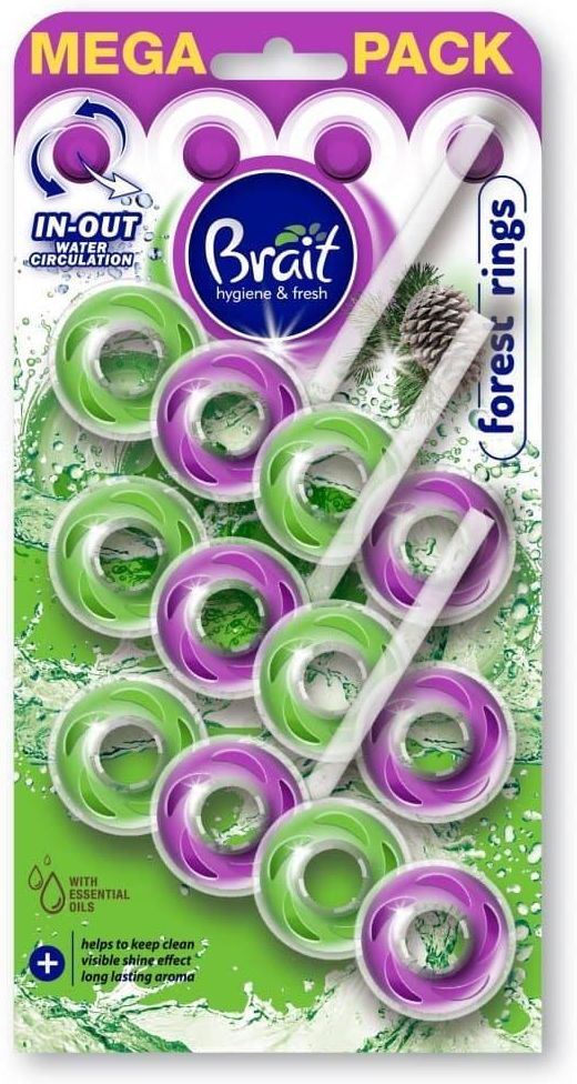 Brait Kostka Toaletowa Forest Rings 3x40g Hygiene & fresh Świeżość i siła zamknięte w oryginalnym pierścieniowym koszyku. Nowa zawieszka Brait Rings łączy w sobie tradycyjny zapach morski, leśny i cytrynowy z niespotykaną intensywnością, wyjątkową pienistością oraz niestandardowymi fluorescencyjnymi kolorami. Brait Rings to widoczny połysk i wsparcie w zapobieganiu osadzania się kamienia w toalecie. Brait Rings IN-OUT Water Circulation wykorzystuje wewnętrzny i zewnętrzny strumień wody, który obmywając kostkę gwarantuje bardzo intensywną pianę i widoczne efekty Twojej pracy, dzięki którym pozostawisz swoją toaletę czystą i świeżą na dłużej. Brait Forest Rings to kostka toaletowa o oryginalnym kształcie, która zamknięta w kilkuwarstwowym pierścieniowym koszyku nie tylko doskonale odświeża i zapewnia widoczne efekty działania, ale również nadaje muszli nowoczesnego charakteru. Połączenie pastelowego fioletu z fluorescencyjną zielenią wzmocni intensywny leśny zapach, który dzięki naturalnym olejkom w składzie będzie uwalniać się do ostatniego spłukania. Brait Forest Rings zapewnia widoczny połysk, wsparcie w zapewnieniu higienicznej czystości i ochrona przed osadzaniem się kamienia w toalecie. Intensywna piana i leśny odświeżający zapach w Twojej łazience.
