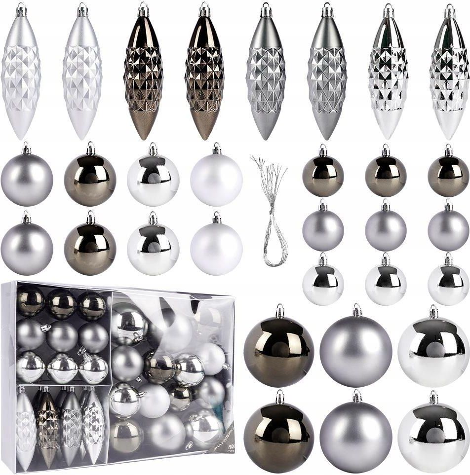 Bombki choinkowe srebrne nietłukące 31 szt. ŚWIĄTECZNE - Zestaw 31 sztuk bombek choinkowych w różnych rozmiarach. W zestawie bombki w kolorze srebrnym oraz grafitowym w wersji błyszczącej oraz matowej. Bombki posiadają sznureczki do zawieszenia. NIETŁUKĄCE - Bombki wykonane są z wysokiej jakości …