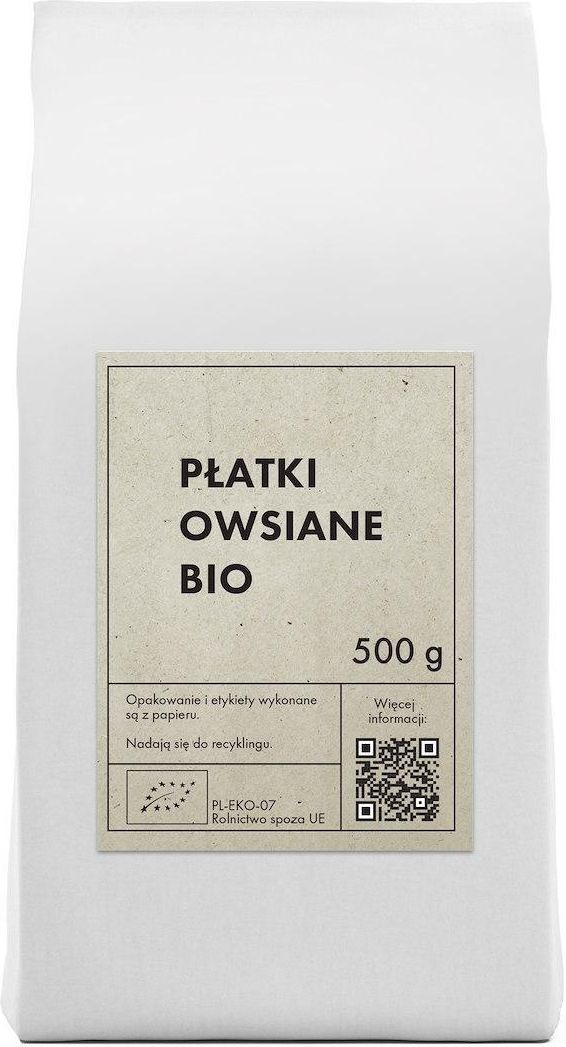 SKŁADNIKI ekologiczne płatki OWSIANE 100 %. OPIS Ekologiczne płatki OWSIANE uzyskuje się z gniecionych ziaren owsa. Płatki OWSIANE to doskonała propozycja na codzienne śniadanie. Najlepiej smakują z dodatkiem jogurtu, napoju zbożowego oraz z owocami. SPOSÓB PRZYGOTOWANIA gotować w proporcji 1:2 (1 porcja płatków na 2 porcje wody lub mleka) na wolnym ogniu ok. 10 minut od czasu do czasu mieszając. WARTOŚĆ ODŻYWCZA W 100 g Wartość energetyczna 1561 kJ/371 kcal Tłuszcz 6,7 g w tym kwasy tłuszczowe nasycone 1,1 g Węglowodany 60 g w tym cukry 0,8 g Błonnik 9,7 g Białko 13 g Sól 0,01 g INFORMACJA ALERGENNA Produkt może zawierać: ORZESZKI ZIEMNE, ORZECHY, NASIONA SEZAMU, SOJĘ. ZALECANE WARUNKI PRZECHOWYWANIA Przechowywać w suchym i chłodnym miejscu. BEZ CUKRU (w składnikach): BEZ CUKRU (w składnikach) Certyfikat bio: CERTYFIKAT BIO EAN: 5902425055892 Kraj pochodzenia składników: Polska Orientacyjny termin przydatności: 18.07.2026 PRODUCENT / DYSTRYBUTOR – NAZWA I ADRES: BIO PLANET S.A., WILKOWA WIEŚ 7, 05-084 LESZNO Wegański: TAK Wegetariański: TAK