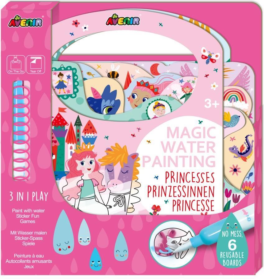 Magiczny obraz wodny - Księżniczka Magiczny obraz wodny - KsiężniczkaMagiczne wodne kolorowanie - bez bałaganu, gdzie tylko chcesz! Książka zawiera 6 powierzchni do kolorowania (wielokrotnego użytku), naklejki tematyczne oraz długopis na wodę do wielokrotnego napełniania. Napełnij pisak wodą, a …