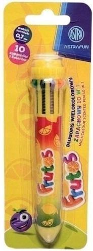 Długopis zapachowy wielokolorowy 10w1 ASTRA FRUTOS - 1 szt. blister Długopis ASTRA FRUTOS to niezwykłe narzędzie do pisania, które łączy w sobie funkcjonalność i przyjemny zapach owoców. Posiada 10 różnych kolorów w jednym długopisie, co umożliwia łatwą zmianę barwy pisma bez konieczności szukania dodatkowych narzędzi. Każdy wkład ma przyjemny zapach owoców, który uprzyjemni korzystanie z niego. Idealny dla tych, którzy szukają czegoś wyjątkowego do codziennego pisania. Cechy produktu: 10 kolorów w jednym długopisie, zapewniając dużą różnorodność Grubość końcówki 0,7 mm, umożliwiająca precyzyjne pisanie Wkłady zapachowe, pachnące owocami Wygodny design, idealny do codziennego użytkowania 1 sztuka w blisterze, gotowa do użycia