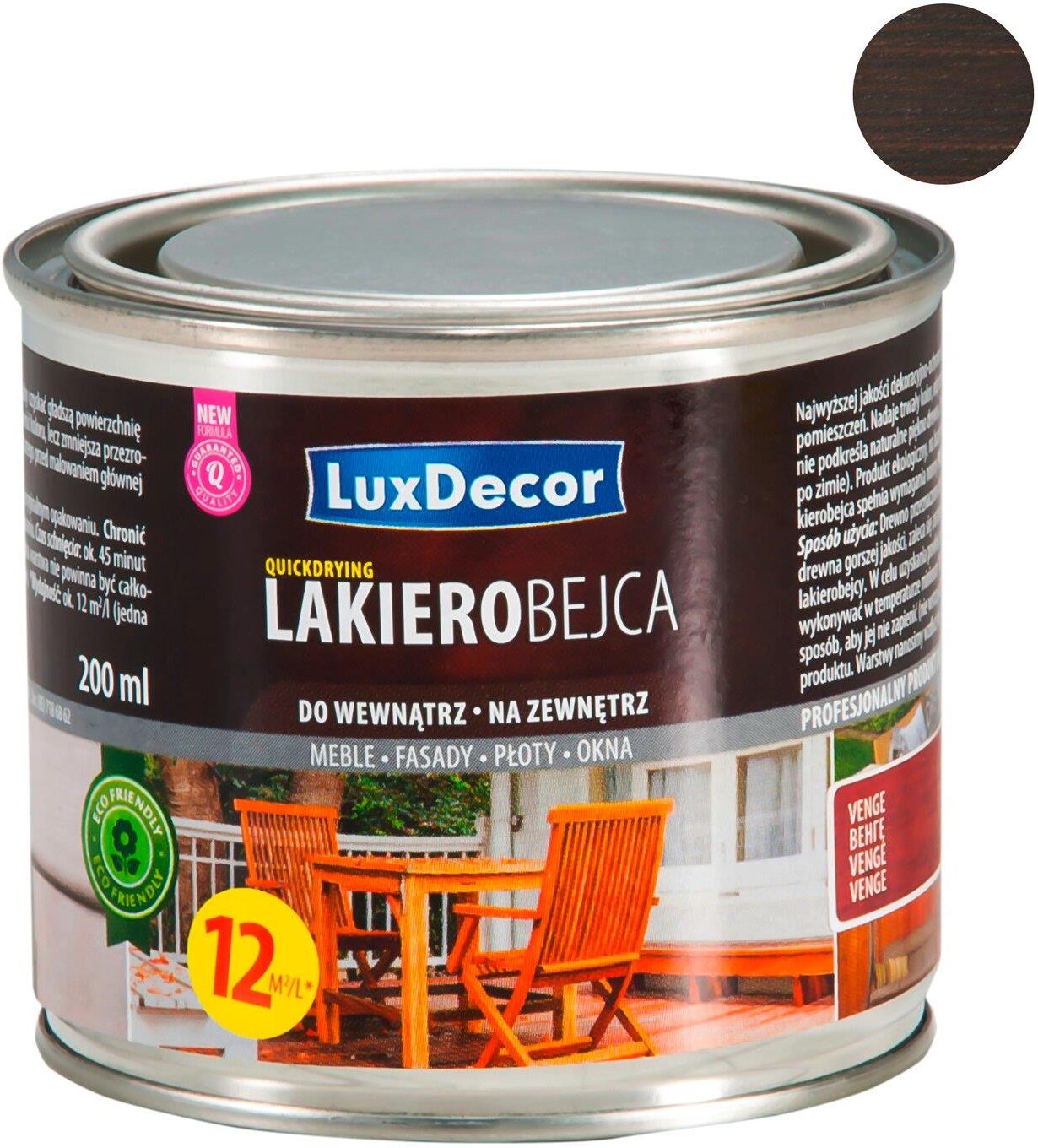 Lakierobejca do drewna, marki LuxDecor.Jest to najwyższej klasy, wodorozcieńczalna lakierobejca ekologiczna. Idealna do dekoracyjno - ochronnego malowania powierzchni wykonanych z drewna. Produkt przeznaczony jest do stosowania zarówno wewnątrz, jak i na zewnątrz pomieszczeń.Środek zabezpiecza drewno wnikając w nie bardzo głęboko, jednocześnie tworząc na jego powierzchni trwałą, odporną na promienie UV powłokę, nadającą połysk i podkreślającą naturalny rysunek drewna. Dzięki temu lakierobejca doskonale nadaje się do zabezpieczania: okiennic, drzwi, okien, mebli ogrodowych, płotów, altanek, fasad domków drewnianych, boazerii itp. Lakierobejca jest przyjazna dla środowiska.