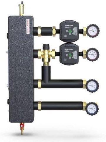Defro DES T 50 zestaw pompowy sprzęgło 2 obiegi Producent: Defro System DES to eneregooszczędny gotowy zestaw grup pompowych dedykowany do obsługi dwóch obiegów grzewczych. Zestawy zostały wyposażone w wysokowydajne pompy obiegowe DEFRO ECOFLOW ENERGY PLUS o szerokim zakresie regulacji. Standardowym wyposażeniem są odpowietrznik, zawór spustowy, a także zawory kulowe z termometrami z funkcją zaworu zwrotnego na powrocie i studzienką pod czujnik temperatury po stronie zasilającej (tylko w grupach mieszających). Izolacja sprzęgła i pomp wykonana jest z EPP, a rur powrotnych i zasilających ze spienionego EPDM co zapobiega nadmiernemu wychładzaniu się czynnika grzewczego. Sprzęgło hydrauliczne wyposażone jest w separator zanieczyszczeń. Konsola montażowa w zestawie. Skład zestawu Sprzęgło hydrauliczne Grupa pompowa bezpośrednie, bez zaworów mieszających Grupa pompowa z termostatycznym zaworem mieszającym Konsola montażowa Dane techniczne sprzęgła Średnica nominalna: DN 32 Maksymalne ciśnienie pracy: 8 bar Przyłącza: 1/2” / 1 ” / 1/2 ” GW Materiały: EPP 60g/l, stal S235, mosiądz Moc grzewcza: 70 kW Maksymalny przepływ: 3,0 m3/h Maksymalna temperatura pracy: 110°C Dane techniczne pompy Maksymalny przepływ: 2800 l/h, 3200 l/h, 3600 l/h Moc wejściowa: 3-23 W, 3-35 W, 3-41 W Wysokość podnoszenia: 4 m, 5 m, 6 m Maksymalne ciśnienie pracy: 10 bar (Pn 10) Zasilanie: 230 V, 50 Hz Podłączenie elektryczne: wtyczka Stopień ochrony obudowy/ Klasa izolacji: IP 42 Regulacja: 3 stałe charakterystyki, 2 charakterystyki proporcjonalne, 2 charakterystyki stałego ciśnienia, redukcja nocna, funkcja antyblokująca, zmiana zakresu podnoszenia, funkcja SMART ADAPT Ochrona silnika: nie jest wymagana zewnętrzna ochrona silnika Temperatura czynnika: +5°C do 110°C Temperatura otoczenia: +0°C do 40°C Wskaźnik sprawności energetycznej EEI: <0,20 Standardowa wielkość przyłączy: G 1½” - Rp1” Długość montażowa: 180 mm Klasa ochronności: I Dopuszczalne media przetłaczane: woda grzewcza wg. VDI 2035, mieszaniny woda-glikol Kod producenta: DES-T-50-DN-25-2S Model: DES-T-50-DN-25-2S