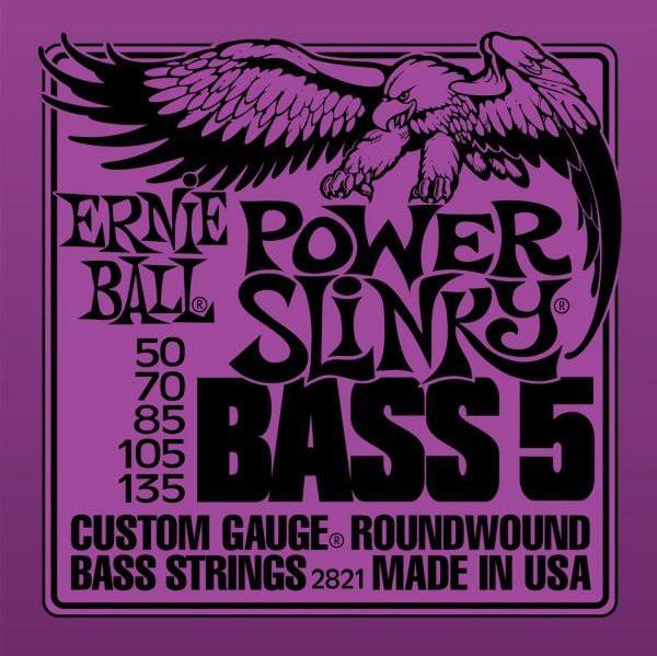 ERNIE BALL EB 2821 seria NICKEL WOUND BASSPOWER - Zestaw 5 strun do gitary basowej pięciostrunowejZestaw 5 strun do gitary basowej pięciostrunowej z serii SLINKY NICKEL ROUND WOUND BASS. Grubości: .050 .070 .085 .105 .135