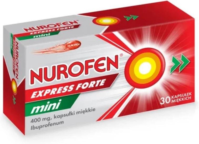 Nurofen Express Forte Mini 400 mg kapsułki to lek przeciwbólowy, przeciwzapalny i przeciwgorączkowy. Wskazania do stosowania: Przeciwbólowe, przeciwzapalne oraz przeciwgorączkowe. Bóle różnego pochodzenia o nasileniu słabym do umiarkowanego (bóle głowy, m.in. ból napięciowy i migrena, bóle zębów, nerwobóle, bóle mięśniowe, stawowe i kostne, bóle towarzyszące grypie i przeziębieniu, bolesne miesiączkowanie). Gorączka różnego pochodzenia (m.in. w przebiegu grypy, przeziębienia lub innych chorób zakaźnych). Skład: 1 kapsułka zawiera: ibuprofen 400 mg. Ponadto lek zawiera: makrogol 600, potasu wodorotlenek, woda oczyszczona. Skład kapsułki: żelatyna, sorbitol ciekły, częściowo odwodniony, woda oczyszczona, czerwień koszenilowa (E 124). Tłuszcz: opacode WB White NS-78-18011 O składzie: tytanu dwutlenek (E171), glikol propylenowy Hypromeloza 3 cP. Substancja pomocnicze w przetwarzaniu: triglicerydy nasyconych kwasów tłuszczowych o średniej dlugości łańcucha, lecytyna. Działanie: Ibuprofen należy do grupy niesteroidowych leków przeciwzapalnych (NLPZ). Leki te działają poprzez zmianę odpowiedzi organizmu na ból i gorączkę Dawkowanie: Lek zawsze należy stosować zgodnie z opisem w ulotce dla pacjenta lub według wskazań lekarza lub farmaceuty. Przed pierwszym zastosowaniem należy skonsultować się z lekarzem. Stosowanie u dorosłych i dzieci w wieku powyżej 12 lat: 1 kapsułkę co 4 godziny. Kapsułkę, jeśli to konieczne, należy popić płynem. Nie stosować więcej niż 3 kapsułki (1200 mg ibuprofenu) w ciągu doby. Nie należy rozgryzać kapsułek. Działania niepożądane: Nurofen Express Forte jak każdy inny lek może powodować działania niepożądane, chociaż nie u każdego one wystąpią; ich wystąpienie można zminimalizować poprzez stosowanie najmniejszej skutecznej dawki przez najkrótszy czas konieczny do zmniejszenia objawów. Należy niezwłocznie przerwać przyjmowanie leku i skontaktować się z lekarzem w przypadku wystąpienia: objawów krwawienia z przewodu pokarmowego, takich jak silny ból brzucha, smoliste stolce, wymioty z obecnością krwi lub ciemnych cząstek wyglądających jak fusy kawy, objawów bardzo rzadkiej, ale poważnej reakcji alergicznej takiej jak nasilenie astmy, niewyjaśniony świszczący oddech lub duszność, obrzęk twarzy, języka lub gardła, trudności z oddychaniem, szybka akcja serca, spadek ciśnienia krwi prowadzący do wstrząsu, poważnej reakcji skórnej, takiej jak wysypka pokrywająca całe ciało, złuszczanie się skóry lub powstawanie pęcherzy. poważnych reakcji skórnych znanych jako zespół DRESS. Często (mogą wystąpić u 1 na 10 osób): Zaburzenia przewodu pokarmowego, np. zgaga, bóle brzucha, nudności, niestrawność, wymioty, wzdęcia, biegunka, zaparcia, niewielkie krwawienie z żołądka i (lub) dwunastnicy mogące w wyjątkowych przypadkach powodować niedokrwistość. Niezbyt często (mogą wystąpić u 10 na 100 osób): Owrzodzenie żołądka lub jelit, czasem z towarzyszącym krwawieniem i perforacją, zapalenie błony śluzowej jamy ustnej z owrzodzeniem (wrzodziejące zapalenie jamy ustnej), zapalenie błony śluzowej żołądka (zapalenie żołądka), Zaostrzenie zapalenia okrężnicy i choroby Crohna. Zaburzenia ośrodkowego układu nerwowego takie jak bóle głowy, zawroty głowy, bezsenność, pobudzenie, drażliwość lub zmęczenie. Zaburzenia widzenia. Reakcje alergiczne, takie jak wysypka, świąd skóry i napady astmy. Rzadko (mogą wystąpić u 100 na 1000 osób): Szumy uszne (dzwonienie w uszach). Uszkodzenie nerki (martwica brodawek) oraz zwiększenie stężenia kwasu moczowego we krwi. Bardzo rzadko (mogą wystąpić u 1000 na 10 000 osób): Podczas stosowania NLPZ zgłaszano przypadki obrzęków, nadciśnienia tętniczego i niewydolność serca. Zapalenie przełyku lub trzustki, tworzenie się przeponopodobnych zwężeń jelita. Podczas ospy wietrznej obserwowano ciężkie zakażenia skóry i tkanek miękkich. Zmniejszenie ilości oddawanego moczu i obrzęki (szczególnie u pacjentów z wysokim ciśnieniem krwi lub z zaburzeniem czynności nerek); obrzęki i zmętnienie moczu (zespół nerczycowy). Zapalenie nerek (zapalenie śródmiąższowe ) mogące prowadzić do ostrej niewydolności nerek. Zaburzenia wytwarzania komórek krwi: pierwszymi objawami są: gorączka, ból gardła, powierzchowne owrzodzenia w jamie ustnej, dolegliwości grypopodobne, silne osłabienie, krwawienia z nosa oraz krwawienia skórne. Reakcje psychotyczne i depresja. Opisywano przypadki zaostrzenia stanów zapalnych związanych z zakażeniem (np. martwicze zapalenie powięzi) w wyniku stosowania niektórych leków przeciwbólowych (NLPZ). Wysokie ciśnienie krwi, kołatanie serca, niewydolność serca, zawał serca. Zaburzenia czynności wątroby, uszkodzenie wątroby, szczególnie podczas długotrwałego leczenia, niewydolność wątroby, ostre zapalenie wątroby. Podczas stosowania ibuprofenu obserwowano objawy aseptycznego zapalenia opon mózgowordzeniowych ze sztywnością karku, bólem głowy, nudnościami, wymiotami, gorączką i zaburzeniami świadomości. Ciężkie reakcje skórne takie jak wysypka z towarzyszącym zaczerwienieniem i powstawaniem pęcherzy (np. zespół Stevensa-Johnsona, toksyczne martwicze oddzielanie się naskórka/zespół Lyella), utrata włosów (łysienie). Ciężkie, uogólnione reakcje nadwrażliwości. Zaostrzenie astmy lub skurczu oskrzeli. Zapalenie naczyń krwionośnych. Interakcje: Często (mogą wystąpić u 1 na 10 osób): zaburzenia przewodu pokarmowego, np. zgaga, bóle brzucha, nudności, niestrawność, wymioty, wzdęcia, biegunka, zaparcia, niewielkie krwawienie z żołądka i (lub) dwunastnicy mogące w wyjątkowych przypadkach powodować niedokrwistość. Niezbyt często (mogą wystąpić u 1 do 10 pacjentów na 100 osób): owrzodzenie żołądka lub jelit, czasem z towarzyszącym krwawieniem i perforacją, zapal