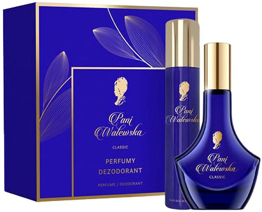 Pani Walewska Zestaw Świąteczny Classic Dezodorant + Woda Perfumowana 30ml Podaruj urok legendarnej elegancji w klasycznej i kobiecej odsłonie, którą odnajdziesz w harmonii delikatnych płatków jaśminu i bogactwie hiacyntu na bazie zmysłowego piżma i drzewa sandałowego. Zielone serce zapachu wzmocniono galbanum. Niebanalny zapach perfum i oryginalna buteleczka o unikatowym kształcie, stylizowanym na kapelusz Napoleona w kolorze kobaltu czyni perfumy obiektem pożądania każdej eleganckiej kobiety. Zestaw upominkowy w eleganckim pudełku zawiera PANI WALEWSKA CLASSIC Perfumowany dezodorant, 90 ml PANI WALEWSKA CLASSIC Perfumy, 30 ml