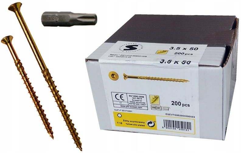 Profesjonalne wkręty ciesielskie hartowane - stożkowe ocynkowane na żółto Rozmiar 4x40 + bit w zestawie w opakowaniu Wysokiej klasy wkręty z profilowanym trzpieniem i szpicem, łeb nacięcie Torx, ocynkowane hartowane Podłoże: wszystkie rodzaje i gatunki drewna oraz materiałów drewnopodobnych …