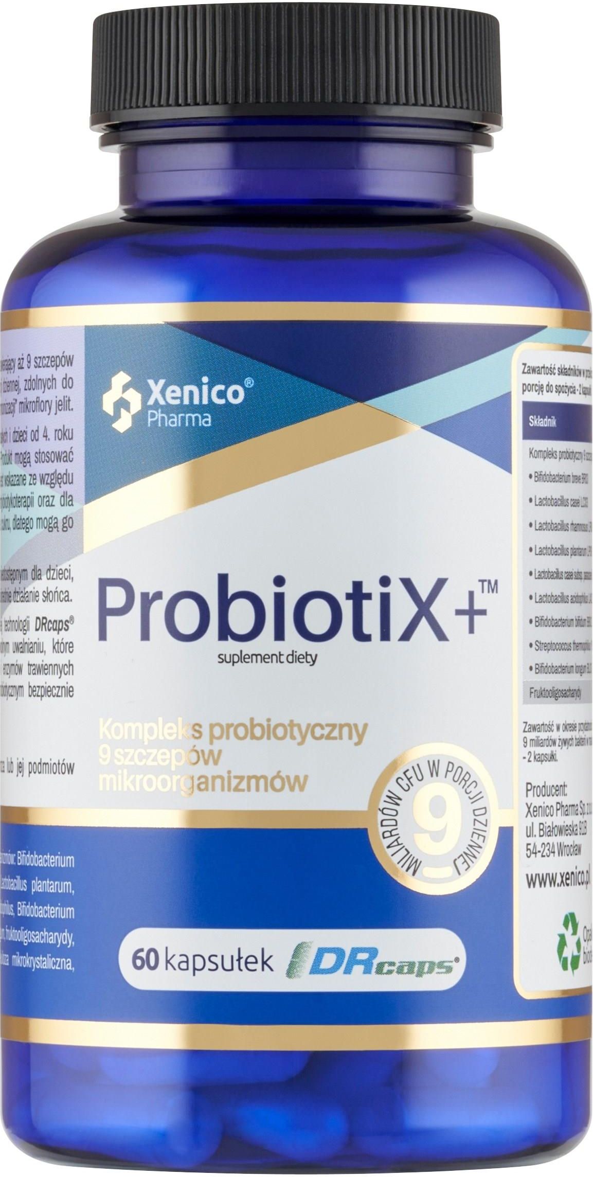 ProbiotiX+ 60 kapsułek ProbiotiX+ to kompleksowy i nowoczesny probiotyk zawierający aż 9 szczepów żywych mikroorganizmów w ilości 9 miliardów w porcji dziennej, zdolnych do optymalnego zasiedlenia przewodu pokarmowego i „harmonizacji“ mikroflory jelit. Przeznaczenie: ProbiotiX+ jest przeznaczony dla dorosłych i dzieci od 4. roku życia w celu uregulowania mikroflory bakteryjnej jelit. Produkt mogą stosować kobiety w ciąży i karmiące piersią. Stosowanie preparatu jest wskazane ze względu na odbudowę mikroflory zarówno w trakcie jak i po antybiotykoterapii oraz dla wzmocnienia odporności organizmu. Produkt nie zawiera cukru, dlatego mogą go stosować także diabetycy. Produkt bezglutenowy. Składniki: Kompleks probiotyczny – 9 szczepów żywych mikroorganizmów (Lactobacillus acidophilus, Lactobacillus casei subssp. Paracasei, Bifidobacterium longum, Bifidobacterium breve, Lactobacillus rhamnosus, Streptococcus thermophiles, Bifidobacterium bifidum, Lactobacillus casei, Lactobacillus plantarum), składnik otoczki – hydroksypropylometyloceluloza, fruktooligosacharydy (FOS), substancja przeciwzbrylająca (sole magnezowe kwasów tłuszczowych), stabilizator – guma gellan.