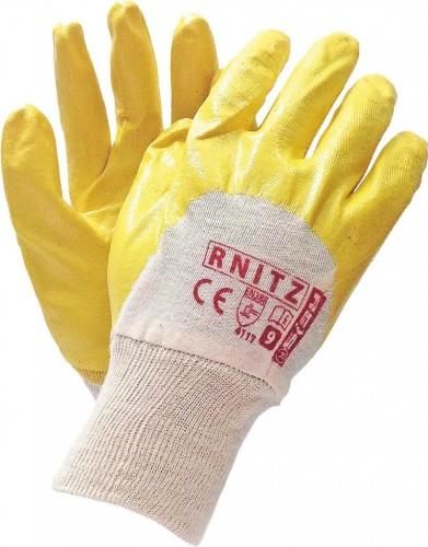 Rękawice ochronne powlekane nitrylem zakończone ściągaczem, Część chwytna oraz do połowy część wierzchnia oblewane powłoką z nitrylu w kolorze żółtym, Odporne na ścieranie, przetarcie czy też przebicie, Zapewniają sprawność elastyczną, Nitryl zwiększa odporność na smary, oleje, tłuszcze i węglowodany, Zachowują swoją formę dlatego też mogą być prane, Sprawdzają się w miejscach gdzie następuje kontakt z wyżej wymienionymi substancjami, Nitryl ulega biodegradacji, dzięki czemu rękawice są bezpieczne dla środowiska, Rekomendowane dla mechaników, wykorzystywane podczas transportu i przeładunku.