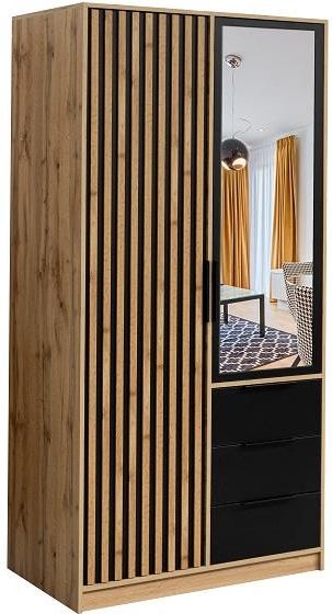 Szafa Laos 2D to propozycja do sypialni ale znajdzie swoje miejsce również w innym pomieszczeniu, jak na przykład - przedpokój czy garderoba. Materiał wykonania to płyta wiórowa laminowana. Szafa posiada trzy półki, trzy szuflady oraz drążek na ubrania. Na frontach znajdują się ozdobne lamele w kolorze czarnym oraz lustro. Nowoczesny styl mebli wpadnie do gustu każdemu, kto poszukuje eleganckiego, klasycznego, a zarazem nowoczesnego umeblowania. Idealnie wpasuje się w większość aranżacji. Przeznaczona do samodzielnego montażu. Do szafy Laos można zakupić dodatkowo nadstawkę Laos D2, komodę Laos 2D lub komodę Laos 3D z tej samej kolekcji. Szafa z drzwiami przesuwnymi, uchylnymi Szafa i meble uzupełniające są ważnym elementem wyposażenia każdego pomieszczenia, który posiada dużo miejsca do przechowywania. Różne rodzaje szaf świetnie sprawdzą się w różnych aranżacjach, np : szafa przesuwna, szafa narożna, szafa wnękowa, a może szafy młodzieżowe sam możesz zdecydować i wybrać odpowiednią szafę do domu, mieszkania, aby wnętrze Naszego salonu, przedpokoju cieszyły i spełniał swoją funkcję. Szafa i jej akcesoria W naszej ofercie znajdziesz różne meble, niezbędny element wyposażenia wnętrz. Wybierając szafy sam zdecydujesz czego potrzebujesz - szafy na ubrania są z wieszaki, szufladami, półkami, do wyboru sposób otwierania- drzwi przesuwne, drzwi uchylne, ilość drzwi, a także szafa z lustrem, które będą doskonale pasowały do wnętrz nowoczesnych. Szeroki wybór szaf w ofercie pozwala dopasować mebel nawet do trudnego do aranżacji pomieszczenia w zależności od potrzeb. Warto więc zapoznać się z całą ofertą i wybrać swoją wymarzoną szafę!
