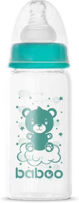 Baboo Anti-colic Glass Feeding Bottle Narrow Neck, 120 ml, Butelki dla niemowląt dla dzieci, Kiedy nie chcesz lub nie możesz już karmić dziecka piersią, idealnie sprawdzi się butelka dla niemowląt Baboo Anti-colic Glass Feeding Bottle Narrow Neck. Specjalnie dopasowany kształt smoczka zapewni dziecku poczucie komfortu, co jest niezwykle ważne przy zaspokajaniu tak podstawowych potrzeb, jak karmienie. Właściwości: zachęca dziecko do aktywności podczas ssania, podobnie jak w przypadku karmienia piersią wyprofilowany kształt ułatwia prawidłowe trzymanie butelki efektywny system odprowadzania powietrza butelka z otworami wentylacyjnymi – redukuje ryzyko wystąpienia kolki z systemem redukcji powietrza smoczek dynamiczny utrzymuje aktywność mięśni jamy ustnej i języka kształt smoczka przypomina pierś matki redukuje częstotliwość kolek Materiał: bez ftalanów