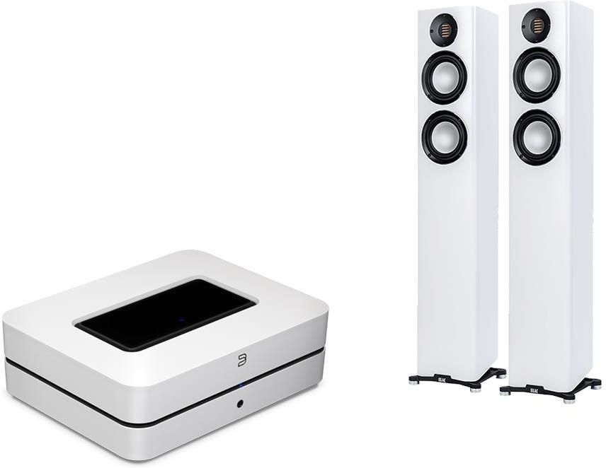 Zestaw składający się z bezprzewodowego, strumieniowego wzmacniacza multiroom Bluesound POWERNODE i kolumn ELAC Carina FS247.4