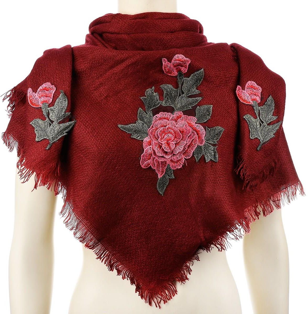 Bordowa ciepła chusta damska szal z wyszywaną różą duża Q81 Zakroczym