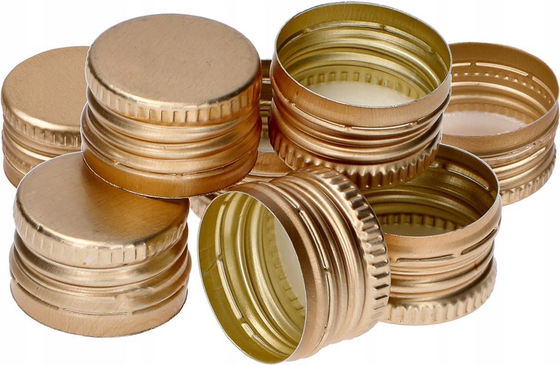 Jeśli przygotowujesz własne nalewki, alkohole z dodatkiem esencji, likiery czy inne procentowe trunki, z pewnością przyda Ci się nasza złota, szczelna zakrętka z atestowanego aluminium, która pasuje do butelek o średnicy szyjki 28 mm. Do kontaktu z żywnością i alkoholami - zakrętka sprawdzi się jako zamknięcie do butelek, z domowymi sokami lub napojami alkoholowymi takimi jak nalewki, likiery czy okowity. Dopasowana do butelek o średnicy gwintu 28 mm - zakrętka pasuje do butelek o pojemności od 0,1 do 1 L, z typowym gwintem monopolowym. Takie zamknięcie daje gwarancję, że butelka nie była wcześniej otwierana. Szczelna - zakrętka posiada uszczelkę, dzięki czemu masz pewność, że po zamknięciu nic z butelki nie wyparuje ani się nie wycieknie. Wyprodukowane w Polsce - zakrętki to produkt polski, wspierasz gospodarkę krajową i masz pewność wysokiej jakości produktu. Zakrętka to dopełnienie butelki. Dzięki niej szczelnie zamkniesz przygotowany, domowy trunek. Oferowane przez nas złote zakrętki przeznaczone są do butelek posiadających średnicę szyjki 28 mm. Zakręcisz ją zarówno butelkę o pojemności 100 ml, jak i butelkę litrową. Dzięki zakrętce masz pewność, że przechowywane w niej trunki będą szczelnie zamknięte, zwłaszcza jeśli do jej zakręcenia użyjesz zaciskarki, która zaciśnie na szyjce pierścień gwarancyjny. Tak zamknięta butelka może posłużyć np.: za prezent z domowym, własnoręcznie robionym alkoholem. Zakrętki mają wysoką jakość, produkowane są w Polsce z atestowanego aluminium. Dopuszczone są do kontaktu z żywnością i napojami alkoholowymi. Do zakręcania rekomendujemy użycie zaciskarki do zakrętek, która zapewni odpowiednie zaciśnięcie pierścienia gwarancyjnego na butelce oraz zapobiega przed nadmiernym przekręceniem zakrętek.