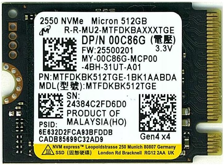 DYSK Micron 2500 2650 512GB SSD NVMe m.2 2230 gen 4x4 gw. 12msc. oryginalny DELL (MTFDKBK512TFK)
