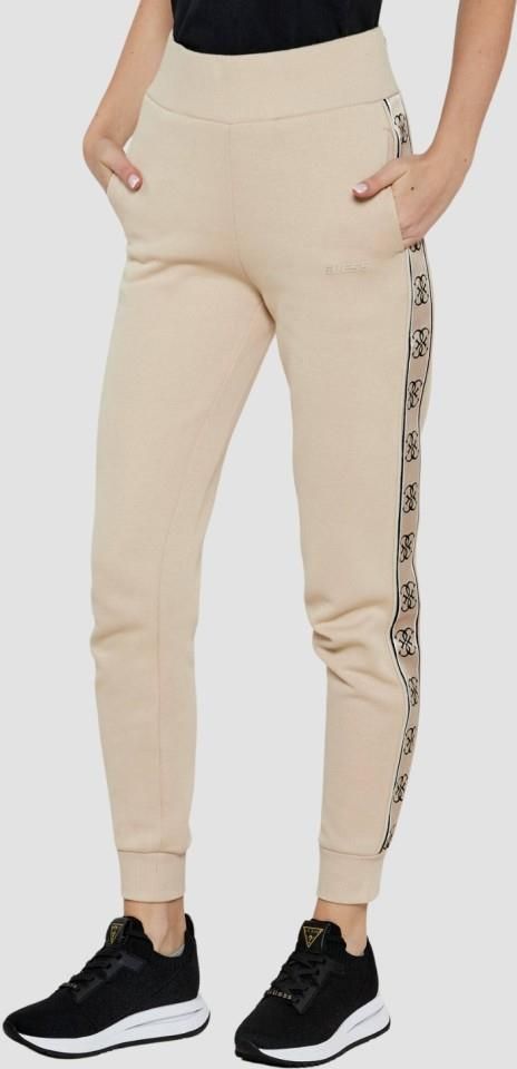Beżowe spodnie dresowe damskie Britney Jogger, marki Guess.Na zdjęciu produkt w rozmiarze: S.Wymiary produktu w rozmiarze S: szerokość w pasie: 34,5 cm, długość nogawki od zewnątrz: 102 cm, długość nogawki od wewnątrz: 73 cm.