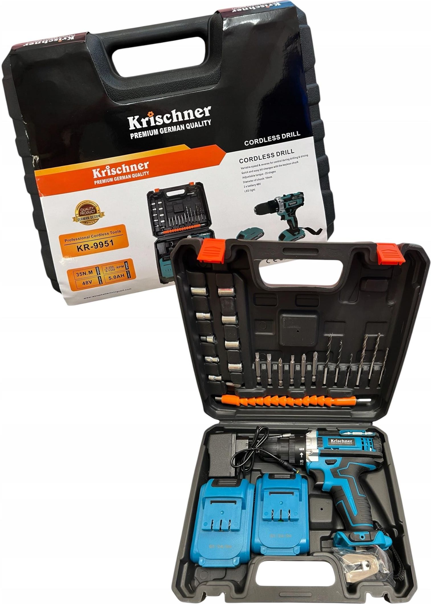 Wiertarka Wkrętarka Akumulatorowa Krischner 2 AKU 48V KR-9951 – Niebiesko-Czarna DANE TECHNICZNE Zasilanie i akumulator Marka: Krischner Napięcie akumulatora:48V Rodzaj akumulatora:Litowo-jonowy (Li-Ion) Liczba akumulatorów w zestawie:2 szt. Pojemność akumulatora:5000 mAh (5 Ah) Czas ładowania:90 – 120 minut Żywotność akumulatora:do 800 cykli ładowania Typ ładowarki:230V / 50Hz / 60W Czas pracy na jednym akumulatorze:do 3 godz. (przy standardowym użytkowaniu) System ochrony akumulatora:TAK (przed przegrzaniem, zwarciem i głębokim rozładowaniem) Silnik i prędkość obrotowa Rodzaj silnika:Elektryczny, szczotkowy Maksymalna prędkość obrotowa:do 1350 obr./min Liczba biegów:2 biegi I bieg:0 – 450 obr./min (precyzyjne wkręcanie) II bieg:0 – 1350 obr./min (wiercenie) Regulacja prędkości:TAK (płynna regulacja za pomocą spustu) Rodzaj przekładni:Metalowa (wzmocniona) Chłodzenie silnika:TAK (otwory wentylacyjne) Poziom hałasu:≤ 75 dB Uchwyt i system mocowania Typ uchwytu:Szybkozaciskowy uchwyt samozaciskowy Zakres mocowania wierteł i bitów:0,8 – 10 mm System blokady wrzeciona:TAK (łatwa wymiana osprzętu) Rodzaj mocowania:Bezkluczowe Moment obrotowy i siła dokręcania Maksymalny moment obrotowy:45 Nm Regulacja momentu obrotowego:19+1 stopni Siła docisku:≥ 120 kg/cm² Tryby pracy: Tryb wkręcania – 19 poziomów siły dokręcania Tryb wiercenia – maksymalna moc bez ograniczeń Kierunek obrotów:Lewo/Prawo (przełącznik zmiany kierunku) Dodatkowe funkcje Wbudowane podświetlenie LED:TAK (automatyczne włączanie) Antypoślizgowy uchwyt:TAK (gumowana rękojeść) Obudowa odporna na uszkodzenia:TAK (wzmocniona, odporną na uderzenia) Wentylacja silnika:TAK (system chłodzenia) Wskaźnik naładowania akumulatora:TAK (trzystopniowy LED) Wodoodporność:IPX4 (odporność na zachlapania) Wymiary i waga Waga urządzenia (bez akumulatora):1,2 kg Waga z akumulatorem:1,8 kg Długość urządzenia:200 mm Wysokość:250 mm Szerokość:75 mm Długość kabla ładowarki:1,5 m Kolor:Niebiesko-czarny ZAWARTOŚĆ ZESTAWU Wiertarko-wkrętarka Krischner KR-9951 – Solidne i wydajne narzędzie z mocnym silnikiem, regulacją prędkości i wbudowanym oświetleniem LED. 2x Akumulator litowo-jonowy 48V (5000 mAh) – Długotrwała praca bez przerw, szybkie ładowanie i zabezpieczenie przed przegrzaniem. Ładowarka sieciowa 230V / 50Hz / 60W – Kompaktowa, szybka i bezpieczna ładowarka z systemem kontroli temperatury. 6x Wiertła do drewna i metalu – Wykonane z wytrzymałej stali, idealne do różnych materiałów. 6x Końcówki (bity) do wkręcania – Najczęściej używane końcówki do śrub i wkrętów, ze stali chromowo-wanadowej. Magnetyczny uchwyt na bity – Ułatwia szybką wymianę końcówek i zapewnia stabilne mocowanie. Walizka transportowa – Wytrzymała, praktyczna i wygodna do przechowywania całego zestawu. Pełny zestaw gotowy do każdej pracy – solidność, wygoda i maksymalna wydajność!
