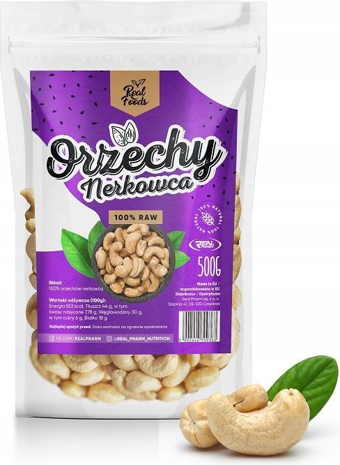 Real Foods - Orzechy Nerkowca Całe 1000g Orzechy nerkowca to delikatne w smaku i niezwykle wartościowe orzechy, cenione na całym świecie za swoje walory odżywcze. Zawierają zdrowe tłuszcze nienasycone, białko, błonnik oraz witaminy z grupy B i minerały, takie jak magnez, cynk, żelazo i fosfor. Dzięki kremowej konsystencji i lekko słodkiemu smakowi stanowią doskonałą przekąskę oraz uniwersalny składnik wielu potraw – zarówno słodkich, jak i wytrawnych. Dlaczego warto? Naturalne źródło zdrowych tłuszczów nienasyconych Bogate w białko, błonnik i witaminy z grupy B Zawierają magnez, cynk, żelazo i fosfor Delikatny, lekko słodki smak Idealne jako zdrowa przekąska lub składnik deserów, sałatek i dań obiadowych Ekonomiczne opakowanie 1000 g Dla kogo? Orzechy nerkowca Real Foods to świetny wybór dla osób ceniących zdrowe przekąski i naturalne źródła energii. Sprawdzą się w diecie osób aktywnych, wegan, wegetarian oraz wszystkich, którzy chcą wzbogacić codzienny jadłospis w wartościowe składniki odżywcze. Skład: 100% orzechy nerkowca całe. Sposób użycia: Orzechy nerkowca można spożywać bezpośrednio jako zdrową przekąskę. Doskonale nadają się również jako dodatek do sałatek, deserów, ciast, musli, a także dań obiadowych kuchni azjatyckiej i wegetariańskiej. Uwagi: Orzechy nerkowca to naturalny produkt, bogaty w tłuszcze i składniki mineralne, dlatego warto spożywać je w umiarkowanych ilościach. Przechowywać w suchym i chłodnym miejscu, niedostępnym dla dzieci.
