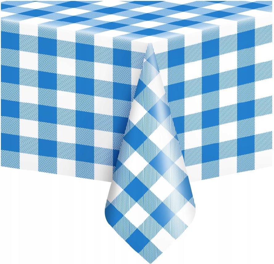 OBRUS NA URODZINY NIEBIESKA KRATKA 137x274cm | KUCMAR Obrus foliowy w kolorze białym w niebieską kratkę. Wodoodporny, świetny na urodziny. Wymiary: szerokość ok. 137 cm, długość ok. 274 cm. 1 sztuka.