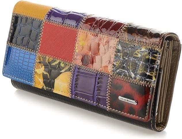 Kolory wielokolorowy Materiał Skóra naturalna Wielkość Duży Kolor okuć Srebrny Zapięcie --- Wysokość (cm) 9 Szerokość (cm) 3,5 Waga(kg) 0,3 Wzór dominujący Marmurkowy Układ/Orientacja Poziom Przegrody na karty/dokumenty 8 Przegrody na banknoty 1 Przegrody na monety 1 Mieści dowód rejestracyjny Tak Zapięcie zewnętrzne Tak Zamknięcie na bigiel Tak Elegancki, wysokiej jakości, duży, damski portfel włoskiej marki Julia Rosso, wykonany z lakierowanej skóry naturalnej Model 02-02 Portfel został starannie wykonany, z dużą dbałością o szczegóły Do jego produkcji użyto wysokiej jakości lakierowanej skóry naturalnej oraz metalowych dodatków w srebrnym kolorze Do każdego egzemplarza dołączamy firmowe, eleganckie, wyściełane pudełko, które sprawia, że portfel idealnie nadaje się na prezent Na froncie znajduje się delikatne, metalowe logo marki Julia Rosso w srebrnym kolorze Przód portfela ozdabia patchworkowy wzór wykonany z "kafelków" ze skóry o urozmaiconej strukturze i w różnych kolorach UWAGA!!! Układ kafelków, tzw. patchworków w każdym portfelu jest nieco inny, w innym układzie, dlatego każdy portfel wygląda unikalnie i jest niepowtarzalny! Portfel zamyka się na zatrzask Jest świetnie zorganizowany. W środku znajdują się: - 1 dwukomorowa przegroda na bilon, zamykana na bigiel - 3 duże przegrody na banknoty - 8 przegród na karty/ID - 1 przeźroczysta przegroda na zdjęcie/ID oraz - 2 wewnętrzne, duże komory na kolejne dokumenty, paragony, bilety czy inne mniej używane rzeczy; jedna z nich jest zamykana na suwak Z tyłu znajduje się jeszcze jedna, duża, niezamykana kieszeń Tył portfela został wykonany z lakierowanej skóry naturalnej o strukturze skóry węża Wymiary: Długość: 18,5 cm Szerokość: 9 cm Głębokość: ok.3,5 cm