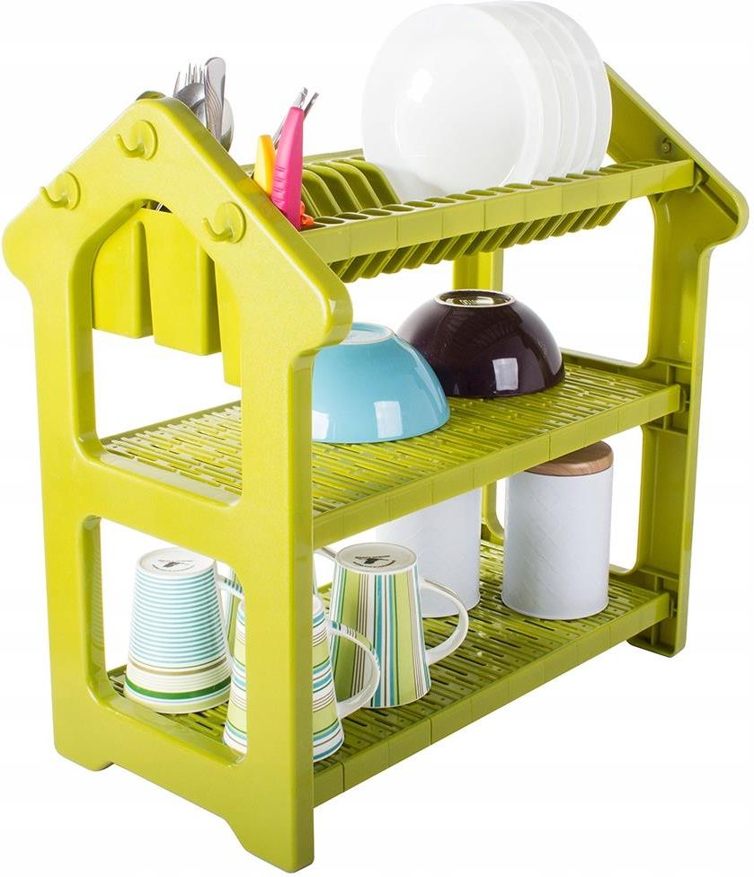 SUSZARKA DO NACZYŃ OCIEKACZ STOJĄCA 3 POZIOMY DUŻA Suszarka kuchenna została wykonana z wysokiej jakości materiałów jest odporna na uszkodzenia oraz działanie wilgoci wynikającej z przechowywania mokrych naczyń. Stabilna konstrukcja z wygodną dużą korytkowaną podstawą, sprawia że woda nie ścieka na blat i nie niszczy mebli. Stojąca suszarka do naczyń to niezbędny sprzęt w każdej kuchni. Jest bardzo praktyczna, z powodzeniem zmieścimy duże ilości talerzy miseczek czy szklanek, posiada aż 3 poziomy suszenia. Wyposażona jest w 6 haczyków na których możemy powiesić akcesoria kuchenne i pojemnik z trzema przegrodami na sztućce. Ciekawy wygląd w kształcie domka nada charakteru w twojej kuchni ibędzie jego funkcjonalną ozdobą. Suszarka jest bardzo pojemna ma miejsce na 18 talerzy, wstawionych w pionowe przegródki, a pozostałe dwa poziomy pomieszczą również miseczki, kubki, filiżanki i inne przybory kuchenne. SPECYFIKACJA TECHNICZNA: ✅ Kod produktu: 07109 ✅ Wysoka jakość wykonania ✅ Stabilna ✅ Wykonana z tworzywa sztucznego ✅ Odporna na działanie nadmiernej wilgoci ✅ Ciekawy wygląd ✅ Dodatkowy ociekacz na sztućce ✅ Pojemna ✅ 3 poziomy suszenie ✅ Posiada tackę na wodę WYMIARY: ✅ Wysokość: 53cm ✅Szerokość suszarki: 52cm ✅ Głębokość suszarki: 27,5cm ✅ Wymiary tacki: 46cm x 25cm ✅ Wymiary pojemnika na sztućce: 25cm x 5cm x 11,5cm ZESTAW ZWIERA: ☑️ Fabrycznie nowa suszarka kuchenna ☑️ 1 wysuwana tacka ☑️ Oryginalne opakowanie