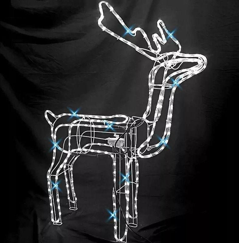 Długość świecącego węża led na stalowej konstrukcji led, to około 11 metrów, na które składa się do 288 energooszczędnych diod. Całość, w ciemności prezentuje się niesamowicie i przyciąga myśli o śnieżnej, mroźnej zimie. Co niezwykle ważne - przepalenie jednej diody nie powoduje zgaśnięcia całego łańcucha. Przewody zasilające ozdobę mają około 1 metra. Renifer posiada dwa sznury zasilające jeden od podświetlenia, a drugi od animacji głowy. Dodatkowe światełka flash skrzą się niczym iskierki w losowych odstępach czasuParametry: Kolor światła stałego: niebieski Do użytku: wewnątrz i na zewnątrz Długość renifera: ok 90 cm Szerokość poroża: 50 cm Wysokość maksymalna renifera: do 100 cm Grubość osłony przewodu: 8,5 mm Przewód wewnątrz: miedziany Grubość stelaża: 3 mm Certyfikaty: CE, RoHS Zasilanie: 220-240V, 50/60 Hz Moc: 16W Długość łańcucha świetlnego: 11m Długość kabla zasilającego: 1 m Ilość diod: do 288 szt. Klasa IP: IP65 Poszczególne elementy konstrukcji do samodzielnego połączenia Solidny, giętki osłona łańcuch świetlny ma grubość niemal 11 mm, a klasa IP65, możesz bez przeszkód umieścić renifera led zarówno w domu, jak i poza nim - w ogrodzie, na tarasie, balkonie. Rzeźbę należy przytwierdzić do podłoża. Gdyż tylko stabilna metalowa konstrukcja, zapewnia niezmienną formę instalacji. Zaczaruj swoje otoczenie. Renifer LED to łatwy sposób, aby nadać domom, tarasom, balkonom czy ogrodom niepowtarzalnego, bożonarodzeniowego charakteru. Idealnie sprawdzi się jako ozdoda na dachu lub w świątecznej szopce.