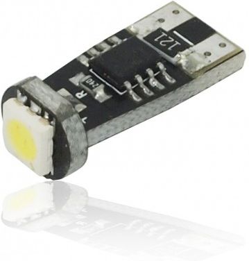 Ilość i typ LED: 1 szt. diod SMD 5050 Rodzaj trzonka:T10 Napięcie zasilania: 10,8-13,8V Barwa światła: biała zimna (xenon look) Kąt świecenia: 120 stopni Trwałość: 50 000 godzin Efektywność energetyczna: A Certyfikaty: CE, RoHS Wysokość: 22mm Szerokość: 0,9mm Żarówka postojowa T10W 4LED. Wyposażona jest w system can bus dzięki któremu na komputerze nie będzie pojawiała się informacja o spalonej żarówce co ma miejsce przy innym oświetleniu tego typu. Żarówka charakteryzuje się szerokim zastosowaniem: - światła postojowe - kierunki boczne - oświetlenie drzwi i schowków oświetlenie wnętrza auta tablice rejestracyjne kontrolki sygnalizacyjne Żarówka posiada bieguny + i - . Jeśli po podłączeniu nie działa oznacza to że trzeba ją umieścić odwrotnie. Nieprawidłowe podłączenie nie powoduje przepalenia.