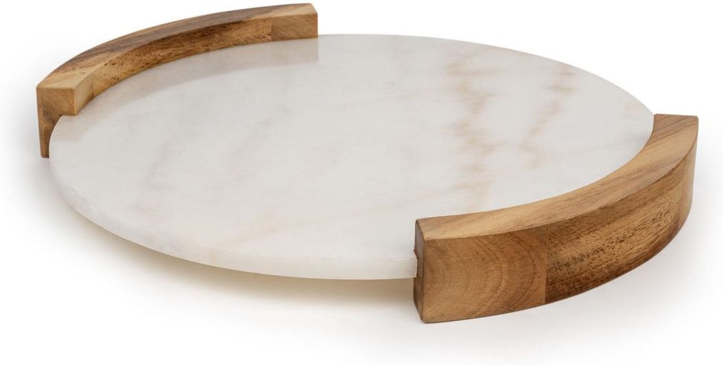 Taca do serwowania z marmuru Viggo / BredemeijerTaca do serwowania z marmuru Viggo marki Bredemeijer to elegancki dodatek, który wprowadzi do Twojego domu naturalny urok i styl. Dzięki połączeniu marmuru i drewna akacjowego, taca zachwyca swoim wyjątkowym designem i solidnym wykonaniem.Najważniejsze cechy: Marmurowy blat: Wykonany z trwałego i ciężkiego marmuru z subtelnym beżowym użyleniem. Każda taca ma unikatowy wzór, co dodaje jej niepowtarzalnego charakteru. Uchwyty z drewna akacjowego: Dodają naturalnego akcentu i ciepła, zapewniają jednocześnie wygodę podczas przenoszenia tacy. Okrągły kształt: Ponadczasowy design, który idealnie sprawdzi się zarówno jako element dekoracyjny, jak i użytkowy.Zalety: Unikalność: Każdy egzemplarz tacy charakteryzuje się indywidualnym wzorem marmuru, co sprawia, że stanowi ona niepowtarzalny element wystroju. Elegancja: Kontrastujące materiały (marmur i drewno) tworzą harmonijną kompozycję, która doda wyrafinowanego stylu do każdej aranżacji. Wszechstronność: Idealna do serwowania napojów, przekąsek, a także jako oryginalne tło do zdjęć typu flat lay.Parametry: Kod producenta: 174030Pielęgnacja:Taca powinna być czyszczona wilgotną ściereczką i dokładnie osuszana. Nie jest przystosowana do mycia w zmywarce, ponieważ naturalne materiały wymagają delikatnego traktowania.Wybierając tacę z marmuru Viggo, wprowadzasz do swojego domu nie tylko przedmiot użytkowy, lecz także prawdziwe dzieło sztuki, które podkreśli wyjątkowy charakter Twojej przestrzeni....