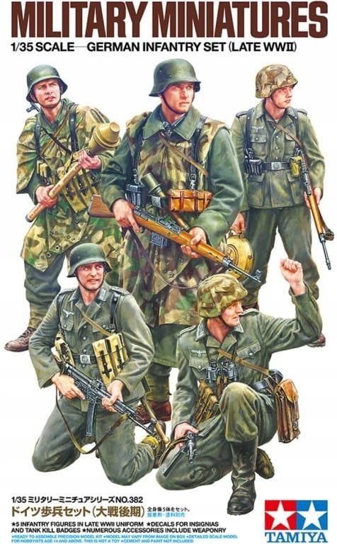 Model Figurek German Infantry Set - Late WWII TAMIYA - nr. 35382 - scale 1/35 Figurki niemiecka piechota z późnego okresu II Wojny Światowej do sklejania i pomalowania z firmy Tamiya nr katalogowy 35382. W skład zestawu wchodzi 5 figurek niemieckich żołnierzy z okresu WWII. Plastikowy model do sklejania i pomalowania w skali 1:35. Klej i farby NIE są zawarte w zestawie - należy zamówić je dodatkowo.