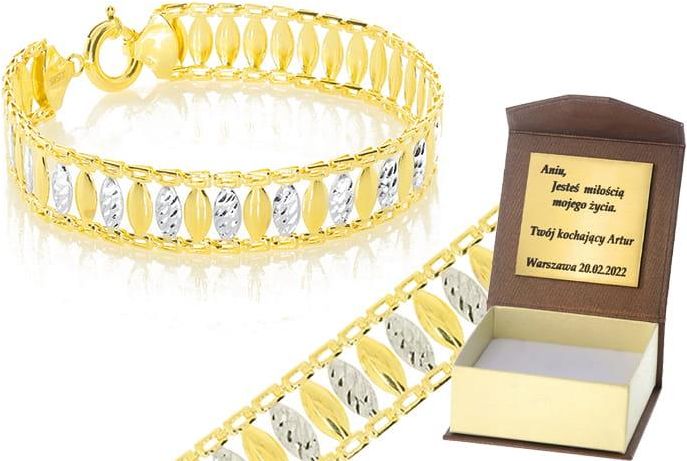 Złota bransoletka Próby 585 Długość bransoletki 19,50 cm. szerokość 1,2 cm Złota bransoletka przedstawiona w naszej ofercie została wykonana z wysokiej jakości złota próby 585. Biżuteria została stworzona z pasją i wielką precyzją, aby zapewnić komfort jej użytkowania. Prezentowana bransoletka dzięki swemu pięknu doda Ci blasku. Jest to biżuteria, która będzie Ci służyć przez długi czas, zarówno od święta jak i na co dzień. W naszej ofercie posiadamy niezwykle szeroki wybór innych modeli bransoletek różniących się wagą, sposobem wykonania a także finezyjnymi wzorami. Dostępne są bransoletki pełne, solidnie zrobione. SPLOT: NIE DOTYCZY PRÓBA: 585 MATERIAŁ: ZŁOTO SZEROKOŚĆ: 1,20 CM DŁUGOŚĆ: 19,50 CM https://sklep652320.shoparena.pl/userdata/public/gfx/8775.jpg Cena: 3856.00 Waga: 9.1 BTC 033 IV 4AU 214175180 W zestawie otrzymujesz: - Nową biżuterię badaną przez Polski Urząd Probierczy - Produkt cechowany zgodnie z polskim Prawem probierczym Dz. U. z 1993 r., Nr 55, poz 249 - Oryginalne firmowe pudełeczko (gratis) - Metkę jubilerską - Na życzenie grawerowaną tabliczkę z dedykacją PRZY ZAKUPIE POWYŻEJ 500 ZŁOTYCH OTRZYMASZ ELEGANCKĄ TOREBKĘ PREZENTOWĄ GRATIS Na życzenie grawerowana dedykacja na tabliczce umieszczonej wewnątrz pudełeczka. W przypadku zakupu powyżej 100 złotych dedykacja gratis. Tabliczka laminowana w kolorze złotym z grawerem dowolnego tekstu w kolorze czarnym. Treść graweru oraz rodzaj pudełeczka należy podać w "wiadomości do sprzedającego" Jeśli nie otrzymamy takiej informacji produkt zostanie zapakowany w standardowe pudełeczko bez dedykacji.