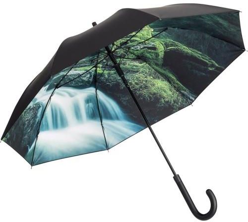 Świetny, nowoczesny parasol długi typu laska z serii Fare Impressions. Parasol z nadrukiem na spodzie czaszy. Kiedy niebo jest szare i smutne, ty nad głową masz widok leśnego zielonego zakątka z pięknym wodospadem. Materiał czaszy jest gruby i od zewnątrz ma specjalną powłokę, która nie namaka, a …